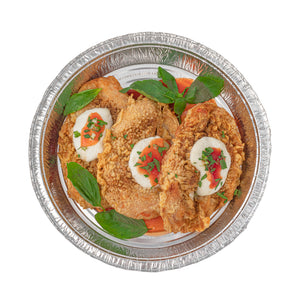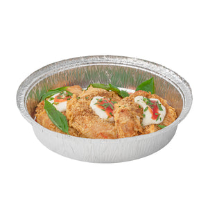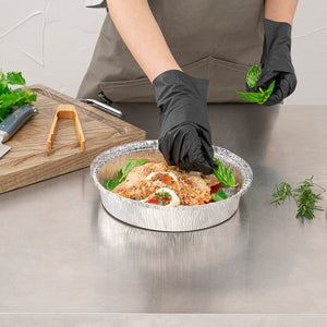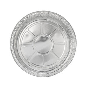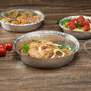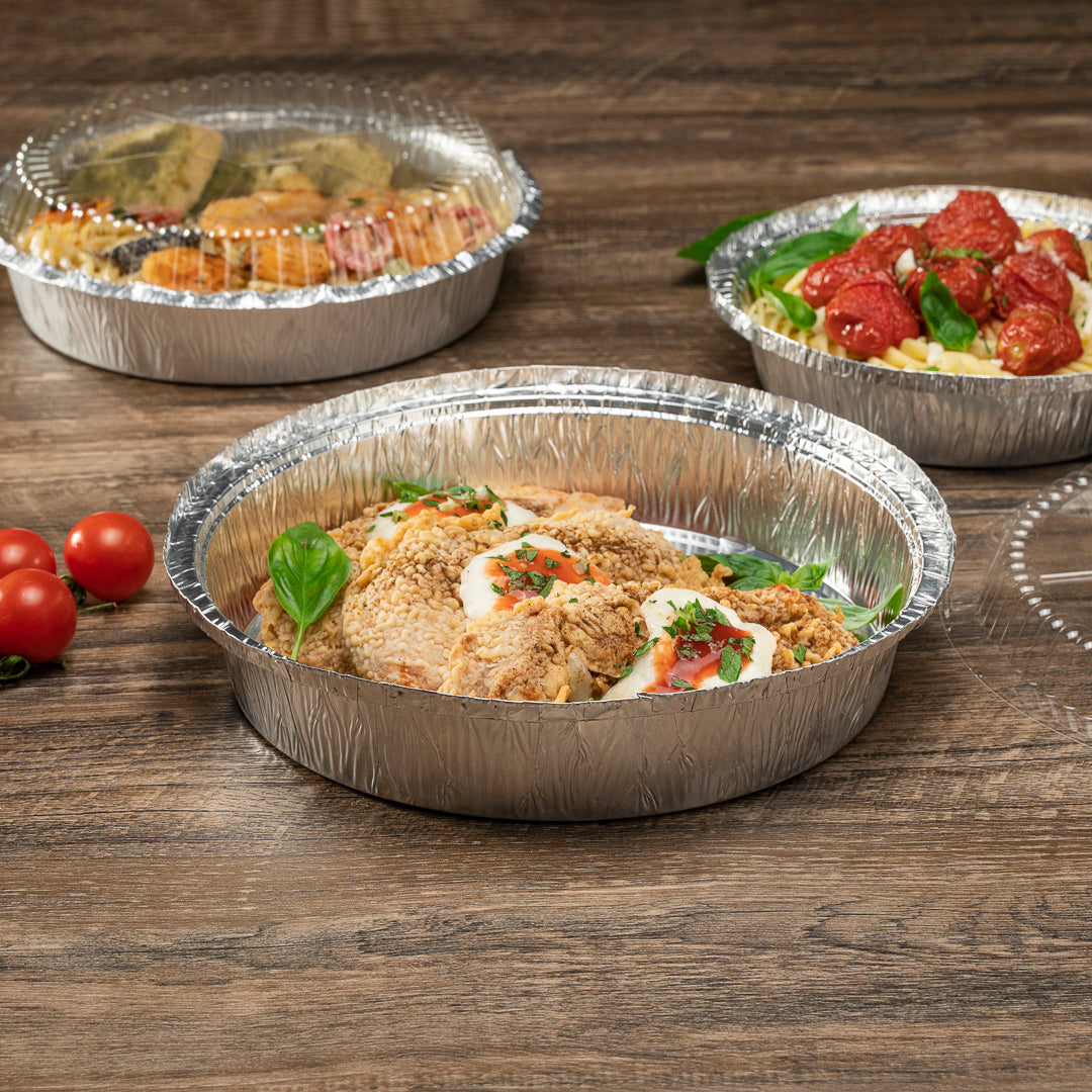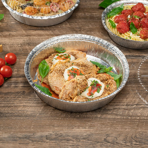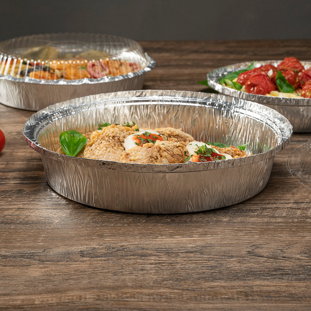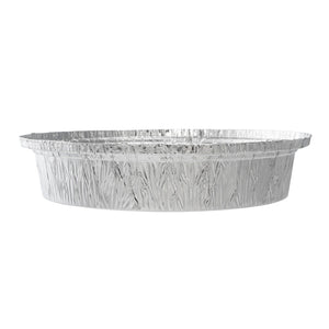 Serve entrees at catered celebrations using our Foil Lux 37-Ounce Round Aluminum Take Out Pans. Crafted from high-quality aluminum foil, these foil containers are durable and won't bend out of shape when filled with large amounts of food. These foil take out pans are oven-safe up to 500F, so you can easily bake dishes to perfection and serve them in the same container. Ideal for storing leftovers in your refrigerator or freezer, these foil to go containers are freezer-safe. Take desserts or entrees securely on the go by pairing these foil containers with our matching lids and sealing them shut by folding down the edges of the containers (SKU: RWM0131W and RWM0132C). Perfect for easy and eco-friendly cleanup, these foil take out pans are recyclable. These foil to go containers are stackable for space-saving storage in your restaurant. Each round foil container holds up to 37 ounces of food and measures 9 inches in diameter by 2 inches in height. Shipped in a 100 count box. Coordinating lids are available and sold separately.