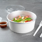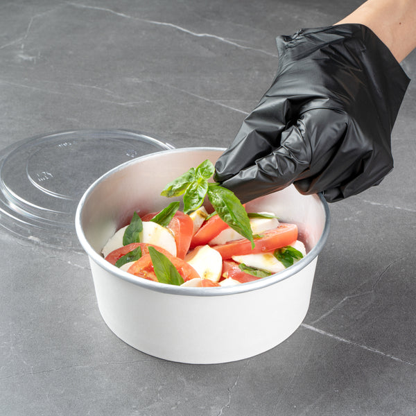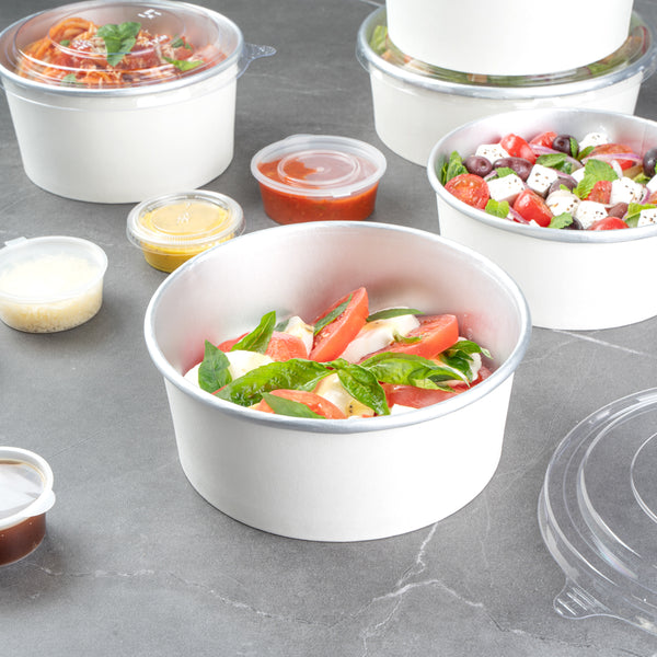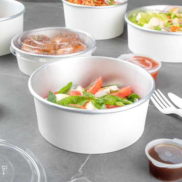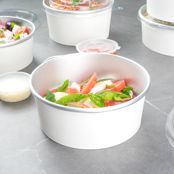 Preserve the freshness of meals with our Foil Lux 37-ounce White Paper Take Out Containers. Equipped with an interior foil lining, these take out containers are insulated and greaseproof to maintain meals fresh and prevent messy leaks. Pair these to go containers with our compatible Foil Lux lids to easily take food on the go (SKU: RWM0153C). Crafted from durable paper and aluminum foil, these food containers can contain hot or cold dishes. With a white finish, these foil containers give your take out orders a classic, clean look. For space-saving storage in your establishment, these white take out containers are stackable. These paper take out containers have a total capacity of 37 ounces and measure 6.5 inches in diameter by 2.5 inches in height. Sold in a 200 count box. Compatible lids are available and sold separately.