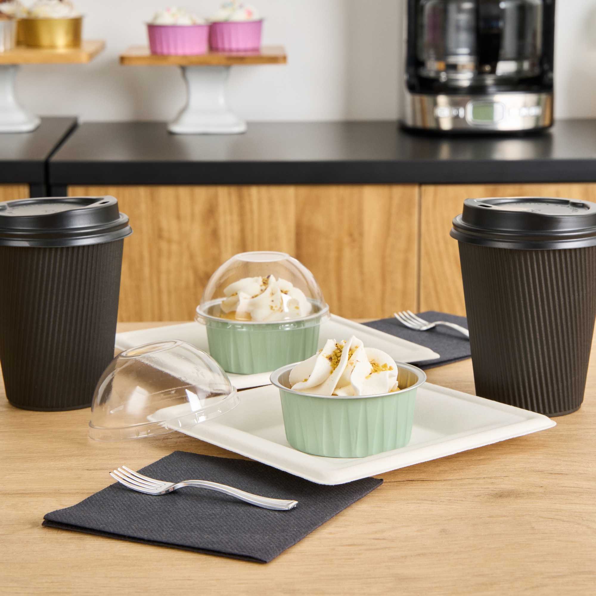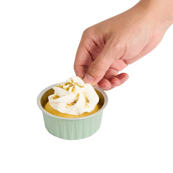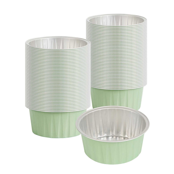 Indulge in your favorite baked goods using our Foil Lux 4-ounce Round Pistachio Green Aluminium Baking Cups. Pop on our Foil Lux matching Dome and Flat lids (SKU: RWM0089C and RWM0090C) to easily transport your baked goods to any venue. Made from aluminum, these disposable baking cups are sturdy and firm to ensure that bending or breaking won't occur during use. The reusable baking cups also feature a flat bottom to evenly distribute heat to make sure your treats are perfectly baked. These green baking cups are grease-resistant to easily release your baked goods without damaging their sweet designs. Oven-safe up to 500F and freezer-safe, these aluminum baking cups make baking and cooling off your sweet treats easy. Featuring a pistachio green finish and a stylish design, these green baking cups add a splash of color to any cupcake, muffin, or hors d'oeuvre. Measuring 3.25 inches in diameter and 1.5 inches in height, these 4-ounce disposable baking cups can be used in bakeries, cafes or kiosks. Sold in a 100 count box. Lids available and sold separately.