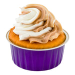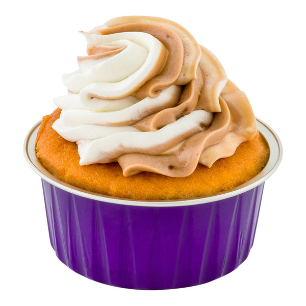 Serve up your favorite sweets using our Foil Lux 4-ounce Round Purple Aluminum Baking Cups. Our specially designed flat and dome plastic lids pair perfectly with these muffin cups (SKU: RWM0089C and RWM0090C) to easily make your treats portable. These purple baking cups are durable and free-standing to remove the risk of bending or breaking during use. Ideal for food establishments, these baking cups are grease-resistant and are crafted with a flat bottom for even heat distribution for fast baking. These purple cupcake cups are freezer-safe and oven-safe up to 500F making them ideal for baking and cooling off chocolate chip muffins, and tres leches cakes. Crafted from premium aluminum, these purple baking cups are disposable to provide a quick and easy cleanup. These baking cups have a bold purple finish and a stylish design that adds a splash of elegance to your delectable mini cakes, pastries, or ice cream. Measuring 3.25 inches in diameter by 1.5 inches in height, these 4-ounce disposable purple baking cups are a must-have for commercial kitchens. Sold in a 100 count box. Lids available and sold separately.