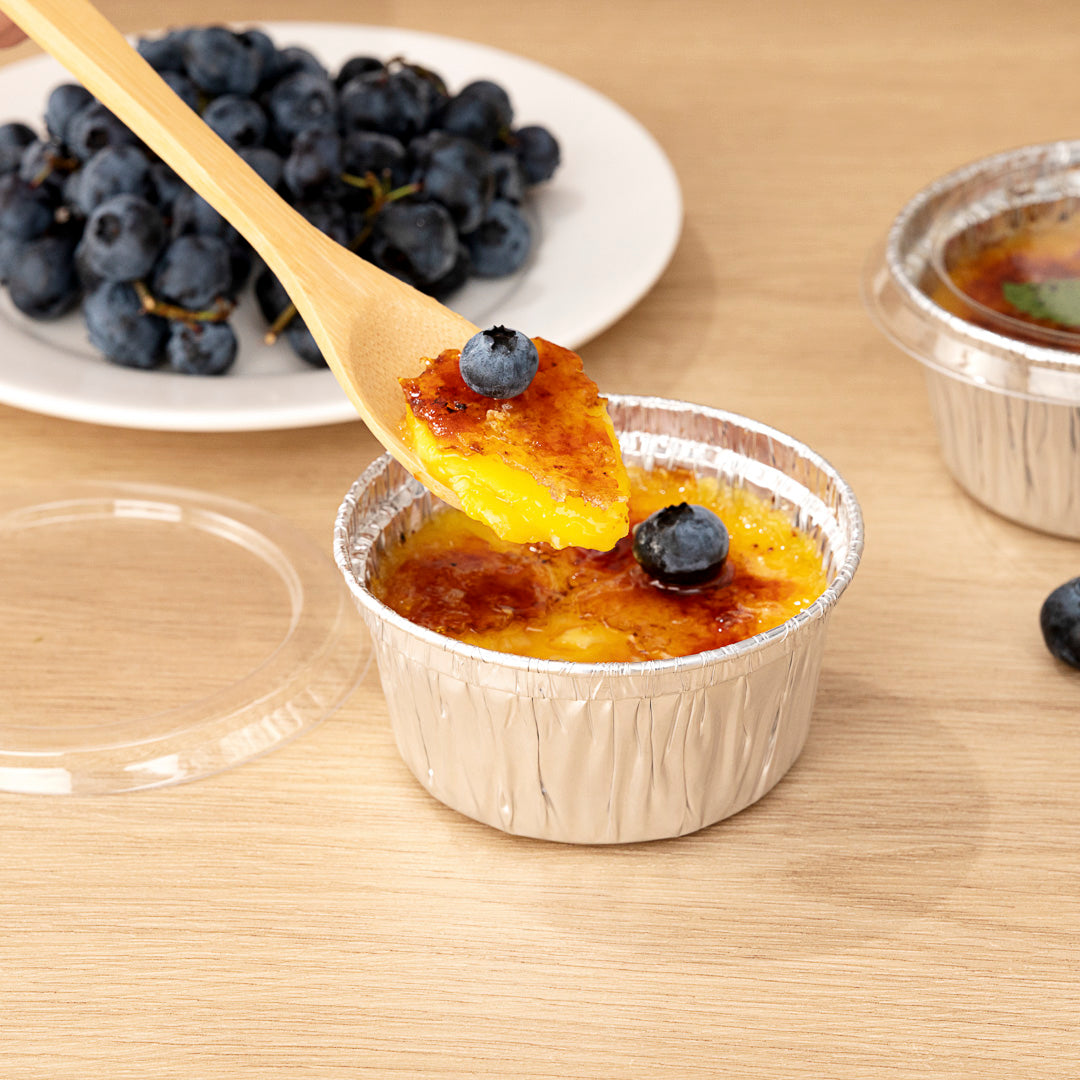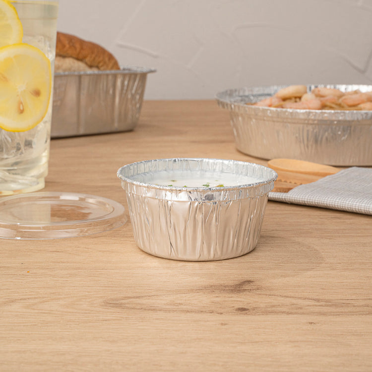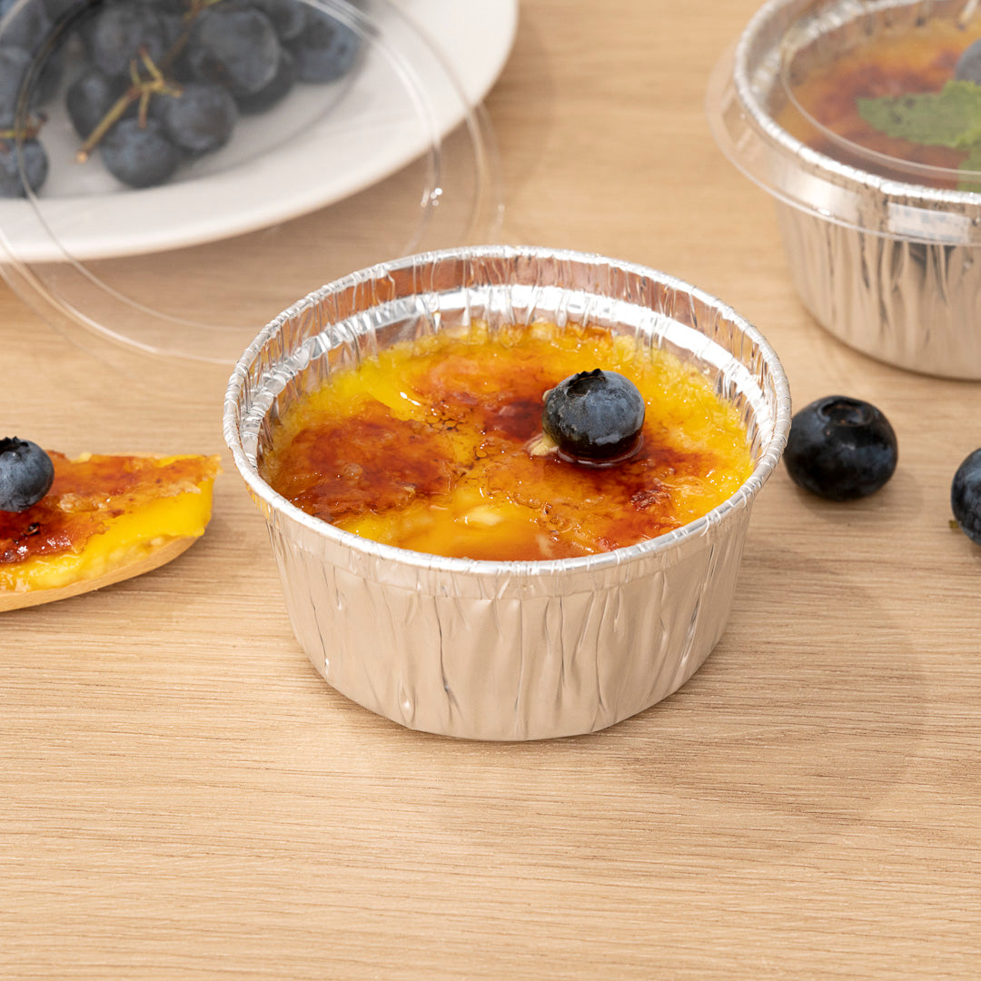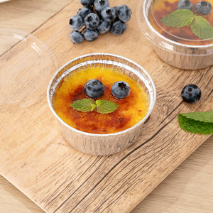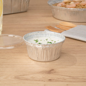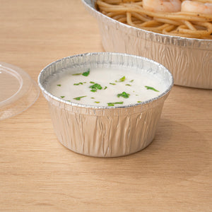 Bake and serve desserts with our Foil Lux 4-ounce Round Silver Aluminum Ramekin / Portion Cups. Made from high-quality aluminum, these ramekin cups are oven-ready for easily making creme brulee or mini pies. Great for keeping sauces fresh, these foil ramekins are freezable so you can easily store food at your catering business or restaurant. These ramekin dishes are stackable to create more space in your storage area. To quickly clean up after guests, these ramekin cups are disposable. Pair these aluminum portion cups with our coordinating flat lids to lock in treats for transport. Measuring 3 inches diameter by 2 inches in height, these disposable ramekins contain up to 4 ounces. Sold in a 100 count box. Lids (SKU: RWM0140C) are available and sold separately.