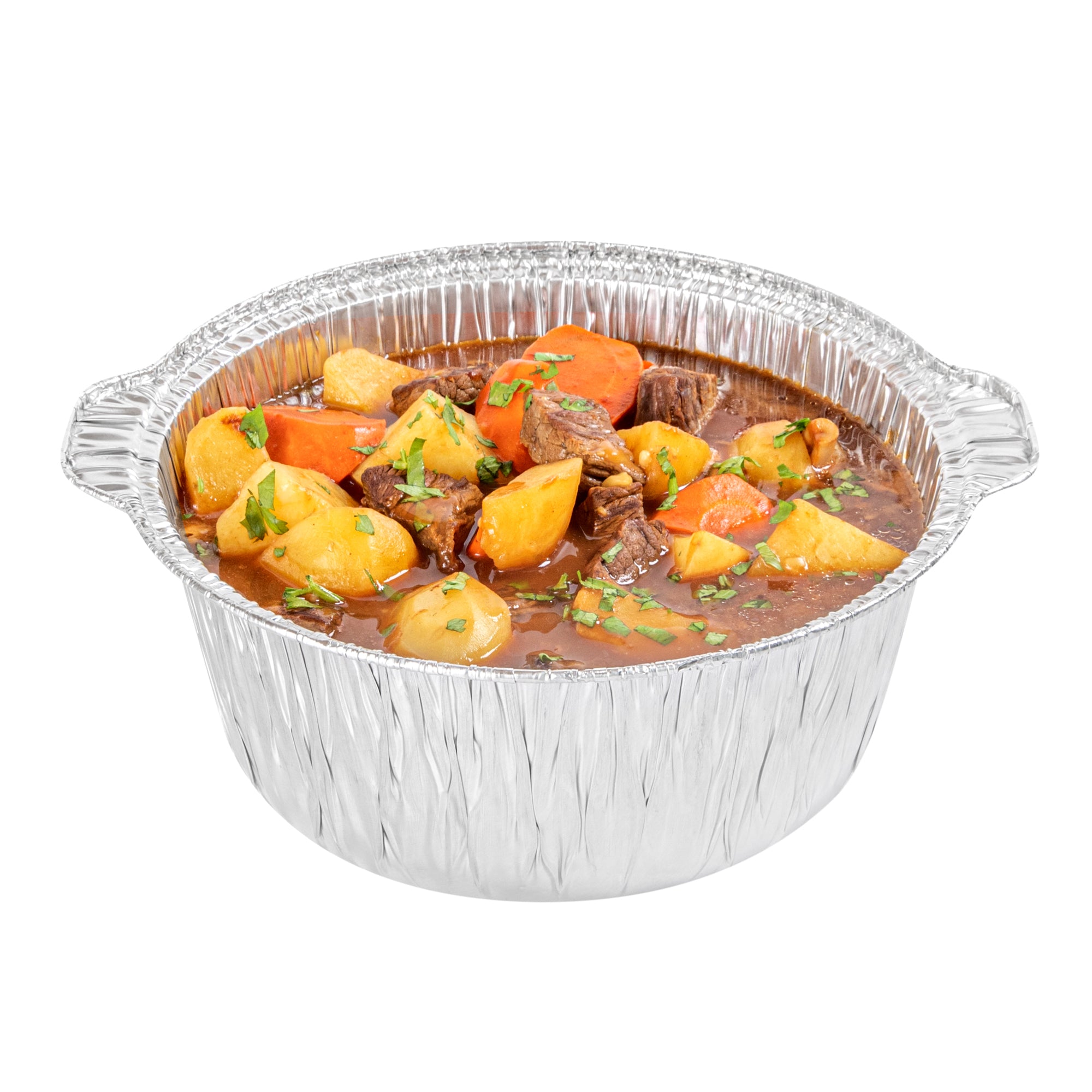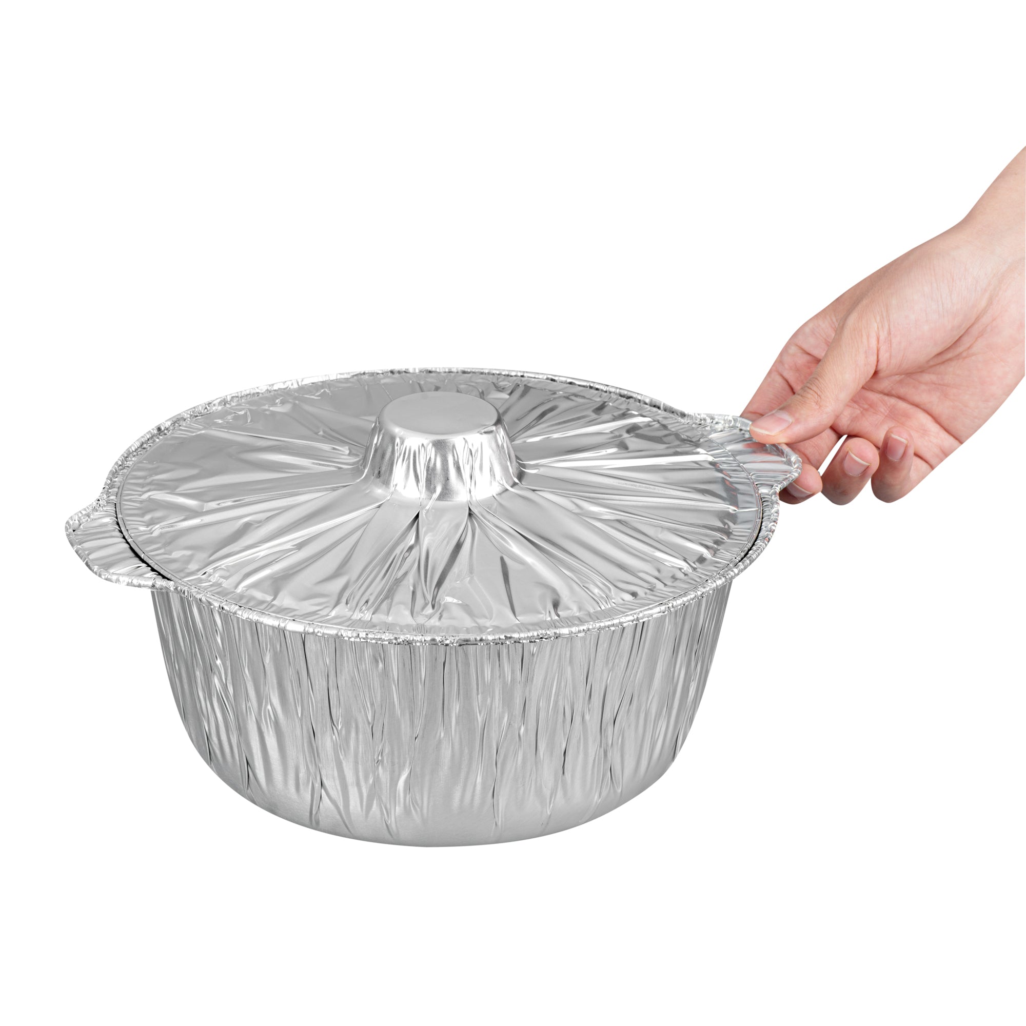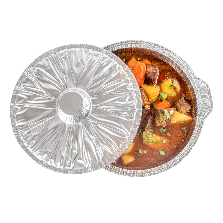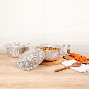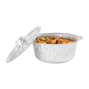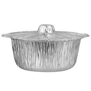 Deliver large portions with ease using our Foil Lux 4 qt Aluminum Foil Pots with Lids. Made from durable aluminum, these disposable pots with lids are ideal for both baking and serving, ensuring a seamless transition from oven to table. With a 4-quart capacity, these large aluminum foil pots are perfect for preparing and transporting hearty meals, making them a must-have for caterers. The snug-fit lid ensures secure transport, while the secure grip pots provide easy handling even when filled with hot contents. These silver disposable pots are designed to be oven-friendly, supporting hot food service with ease, and are also freezer-friendly for efficient storage. Featuring a round aluminum shape with a sleek design, they are greaseproof and maintain their integrity under high temperatures. Measuring 11.4 inches in diameter, 10.25 inches in width, and 4.7 inches in height, these round foil pots are spacious enough to accommodate large quantities. Sold in a 10 count box.