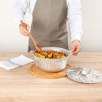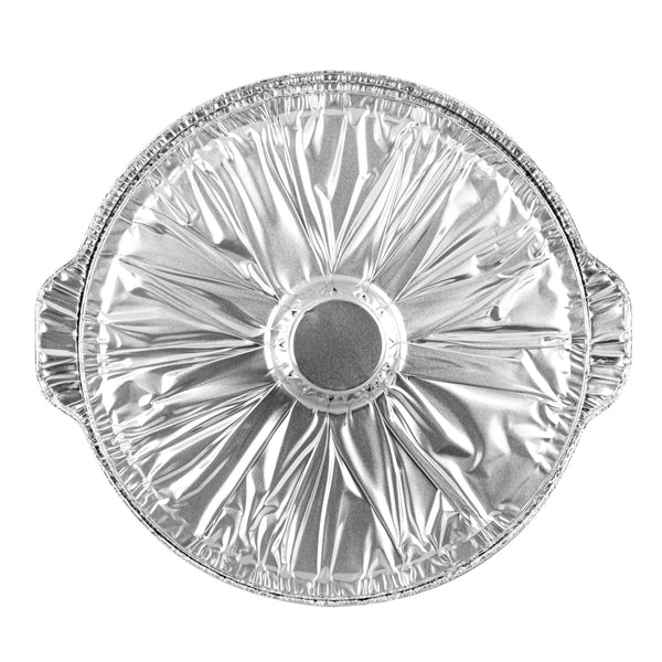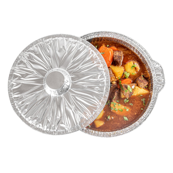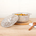Deliver large portions with ease using our Foil Lux 4 qt Aluminum Foil Pots with Lids. Made from durable aluminum, these disposable pots with lids are ideal for both baking and serving, ensuring a seamless transition from oven to table. With a 4-quart capacity, these large aluminum foil pots are perfect for preparing and transporting hearty meals, making them a must-have for caterers. The snug-fit lid ensures secure transport, while the secure grip pots provide easy handling even when filled with hot contents. These silver disposable pots are designed to be oven-friendly, supporting hot food service with ease, and are also freezer-friendly for efficient storage. Featuring a round aluminum shape with a sleek design, they are greaseproof and maintain their integrity under high temperatures. Measuring 11.4 inches in diameter, 10.25 inches in width, and 4.7 inches in height, these round foil pots are spacious enough to accommodate large quantities. Sold in a 100 count box.
