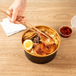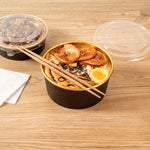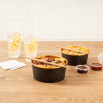 Retain the warmth of customers' takeaway dishes using our Foil Lux 42-ounce Black And Gold Paper Carry Out Containers. With an interior lining made of foil, these carry out containers are built to offer insulation, thereby keeping dishes hot for an extended duration. Pair these disposable containers with our Foil Lux lids for secure covering of food orders during transit (SKU: RWM0153C). Constructed from premium paper and aluminum foil, these meal containers are resistant to grease, making them ideal for transporting hot and cold food. Showcasing a sleek black shade, these paper food containers effortlessly harmonize with your eatery's aesthetic or color theme. To maximize space utilization in your kitchen or storage segment, these black take out containers can be stacked. Suitable for a broad array of meals, the dimensions of these paper containers are 6.5 inches in diameter by 3 inches in height, with a capacity of up to 42 ounces. Sold in a 50 count box. Lids are available and sold separately.