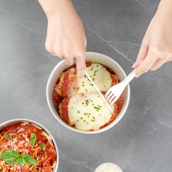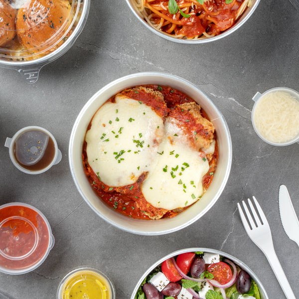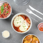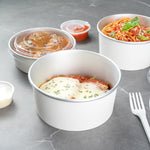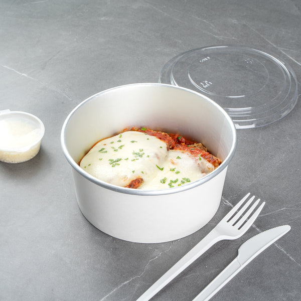 Maintain the temperature of customers' to go meals using our Foil Lux 42-ounce White Paper Take Out Containers. Constructed with an interior foil lining, these take out containers are insulated to keep meals warmer for longer. Match these to go containers with our compatible Foil Lux lids to conveniently cover food orders during transport (SKU: RWM0153C). Crafted from premium paper and aluminum foil, these food containers are greaseproof and perfect for carrying hot or cold foods. Designed with a clean white finish, these paper food containers easily match your restaurant's theme or colors. To save space in your kitchen or storage area, these white take out containers are stackable. Perfect for all types of meals, these paper take out containers measure 6.5 inches in diameter by 3 inches in height and can hold up to 42 ounces. Sold in a 200 count box. Compatible lids are available and sold separately.