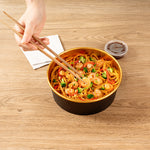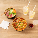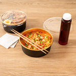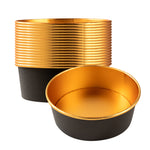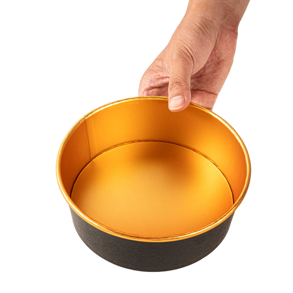 Enhance your takeaway orders with our Foil Lux 45-ounce Black And Gold Paper Take Out Containers. These greaseproof take out containers feature an insulated interior foil lining that keeps your meals fresh and warm. Made from robust paper and aluminum foil, these food containers are ideal for both hot and cold food items. These to go containers pair perfectly with our Foil Lux lids (SKU: RWM0155C) for secured on-the-go orders. The black finish of these takeaway containers adds a stylish touch to your customers' orders. For efficient food packaging, these black food containers can be easily stacked. These paper take out containers measure 7.25 inches in diameter by 2.5 inches in height, and have a capacity of 45 ounces. Sold in a 50 count box. Compatible Foil Lux lids are available and sold separately.