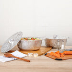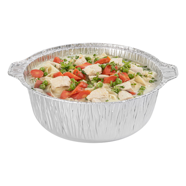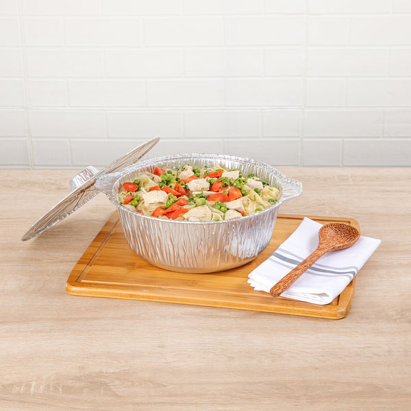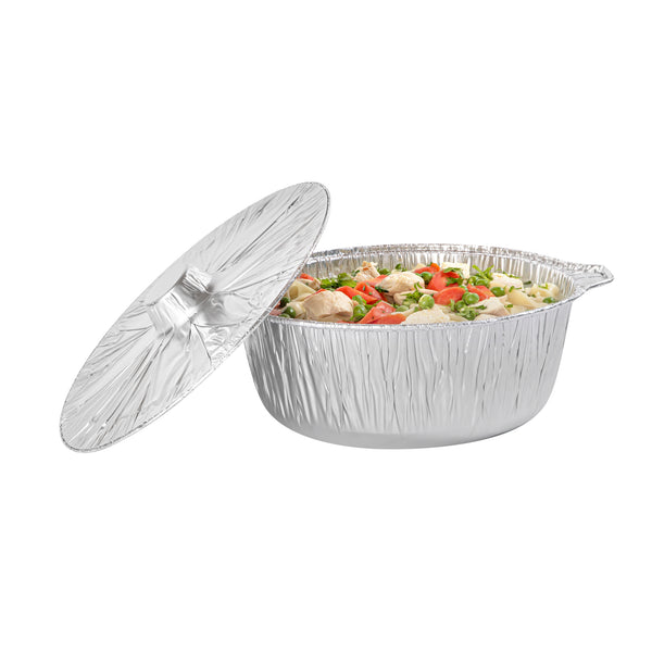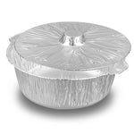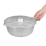 Serve and store large meals with our Foil Lux 6 qt Aluminum Foil Pots with Lids. These versatile aluminum foil pots are crafted from durable foil, offering dependable performance for high-volume cooking. With a 5.6-quart capacity, these round foil pots are perfect for preparing soups, stews, or casseroles at catering events or commercial kitchens. Their oven-friendly construction allows for seamless baking and serving, while the freezer-friendly design supports advance meal prep and storage. The greaseproof aluminum surface preserves presentation by preventing leaks and stains. Designed with secure grip edges, these aluminum disposable pots offer comfortable handling during transport. These recyclable aluminum pots are a practical, eco-conscious solution for busy foodservice operations. Measuring 13.4 inches in diameter, 12 inches in width, and 4.7 inches in height, these catering aluminum containers accommodate large portions with ease. Sold in a 10 count box.