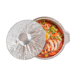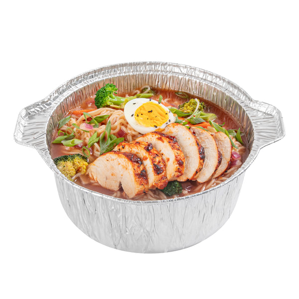 Streamline meal prep and transport with our Foil Lux 60 oz Aluminum Foil Pots with Lids. These aluminum takeout containers are designed to meet all your foodservice needs with their multifunctional capabilities, seamlessly serving as oven-friendly pots for efficient hot meal preparation and as freezer-friendly aluminum pots for extended storage. With 60 ounce capacity, these aluminum pots with secure handles and snug-fit lids are perfect for transporting soups or casseroles in a catering environment. The round aluminum containers feature a greaseproof surface that ensures easy cleanup, while their durable construction allows them to double as disposable cooking pots. These silver aluminum pots are not only practical but also aesthetically pleasing, making them suitable for both meal prep containers and casserole transport containers. Measuring 9.8 inches in diameter, 8.75 inches in height, and 3.7 inches in depth, these aluminum foil pots are sturdy. Sold in a 100 count box.
