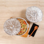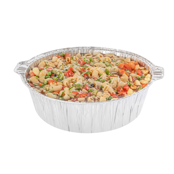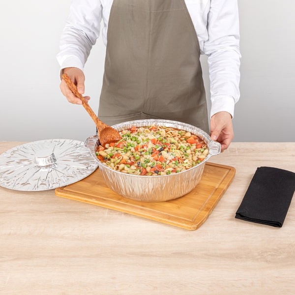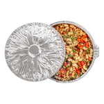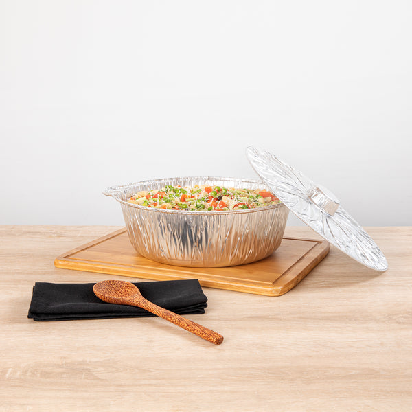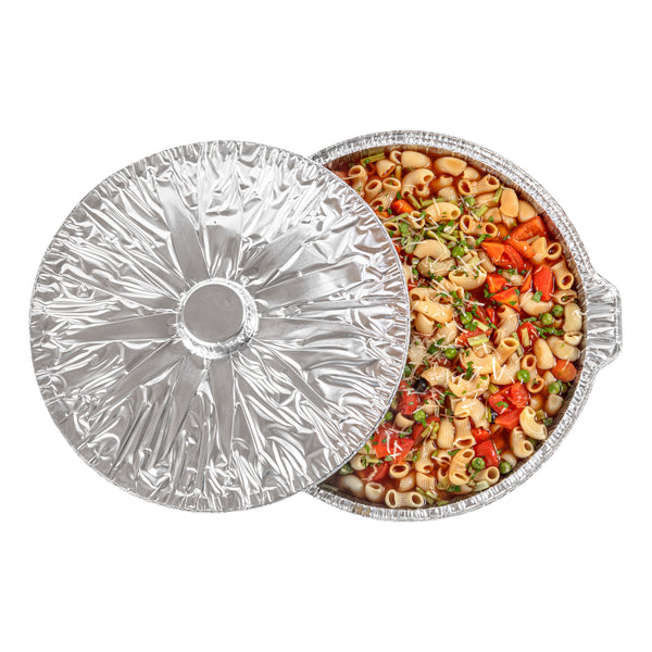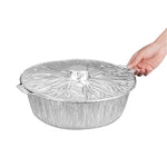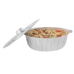 Serve large portions with ease using our Foil Lux 8 qt Aluminum Foil Pots with Lids. These disposable aluminum foil containers are built for high-capacity cooking and seamless meal prep. With an 8.45-quart capacity, these round aluminum pots are ideal for baking, storing, or transporting entrees and side dishes. Crafted from sturdy aluminum, these oven-friendly pots allow direct baking, while their freezer-friendly build supports efficient cold storage. The greaseproof surface keeps messes at bay, preserving the clean presentation of your food. Designed with secure grip edges, these aluminum disposable pots offer reliable handling in fast-paced environments. These recyclable aluminum pots provide a practical, eco-conscious choice for caterers and restaurants. Measuring 15.4 inches in diameter, 14 inches in width, and 4.7 inches in height, these pots are perfect for large-scale foodservice. Sold in a 50 count box.