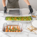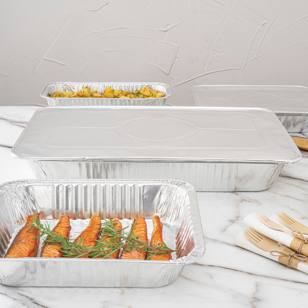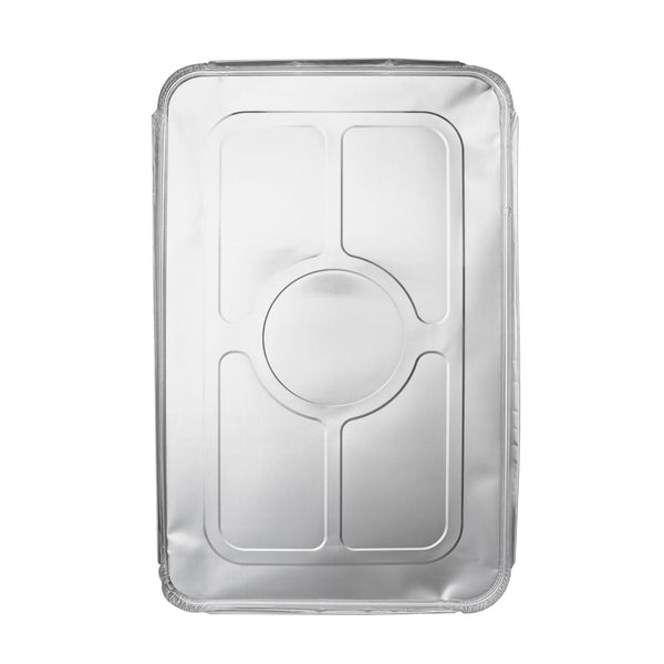 Ensure flawless food presentation with the Foil Lux Aluminum Steam Table Pan Lid. This aluminum pan cover is crafted from robust aluminum to provide dependable performance, preventing spills and maintaining the integrity of your dishes during transport and service. Designed to fit standard full-size steam table pans, this full size pan lid creates a secure seal for a wide range of meals, enhancing operational efficiency. Its greaseproof coating ensures a clean presentation by repelling unwanted stains and splatters, making it ideal for buffet lines or catering events. The oven safe design supports hot food service, allowing dishes to retain heat and remain appetizing. With its recyclable construction, this disposable pan cover aids in reducing waste, aligning with eco-conscious practices. At 21.06 inches in length and 13.5 inches in width, this cover is conveniently stackable, enabling space-saving storage and organization. Each order includes 25 lids.