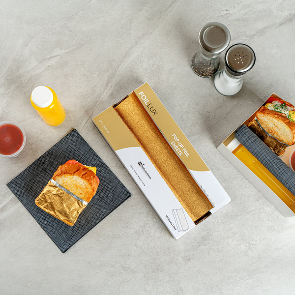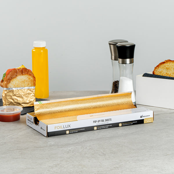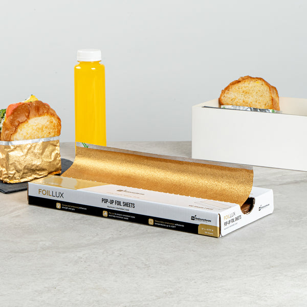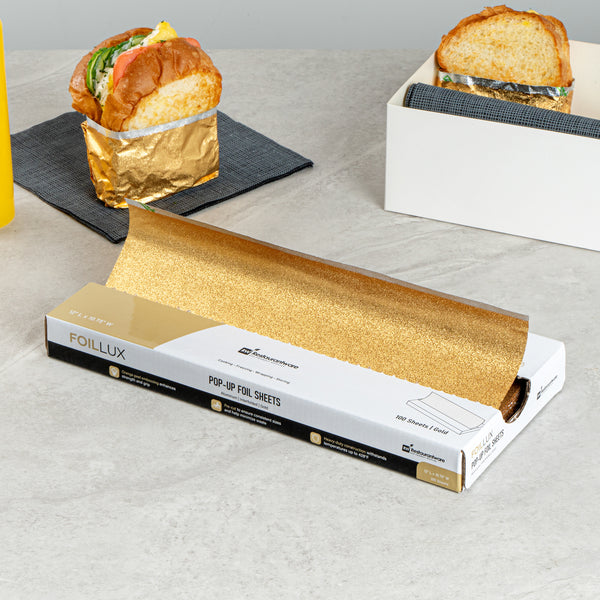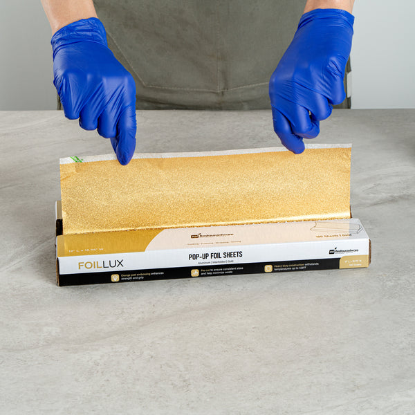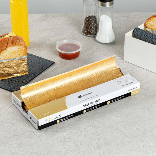 Boost your kitchen's efficiency with our Foil Lux Foodservice Gold Aluminum Foil Pop-Up Sheets. The high-quality, durable aluminum construction of these pre-cut foil sheets offers robust resistance to temperatures up to 428F, ensuring oven-safe and freezer-safe use. These pop-up foil sheets feature unique orange peel embossing, adding sophistication to your food presentation. The interfolded design of these foil sheets for food ensures ease of separation without the need for a blade, promoting sanitation and minimizing contact. With a greaseproof design, these aluminum foil sheets prevent messes while packing saucy foods. Say goodbye to the trouble of traditional foil rolls with these disposable and recyclable aluminum paper sheets, ready for immediate use and helping reduce waste and save time. Measuring 12 inches in length by 10.75 inches in width, these premium embossed foil paper sheets help retain heat on various foods, making them a kitchen must-have. Sold in a 100 count box.
