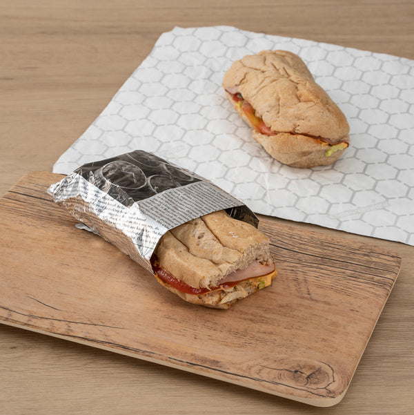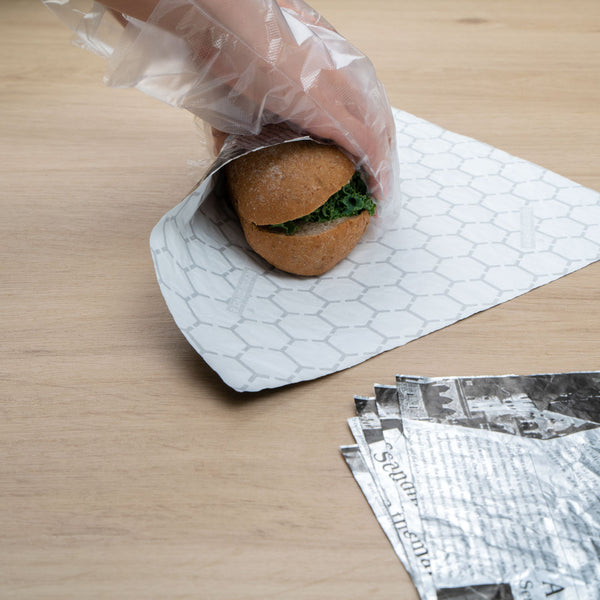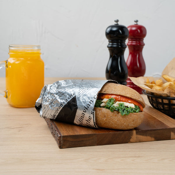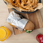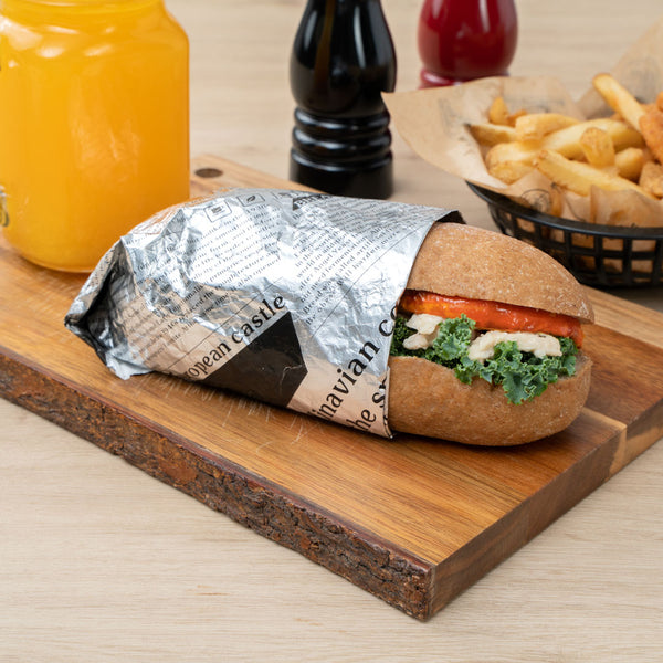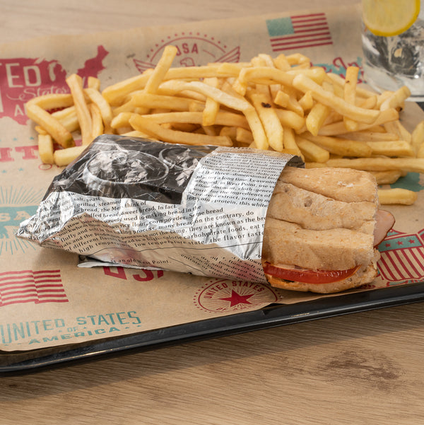 Provide customers with a mess-free way to enjoy burgers or sandwiches using our Foil Lux Rectangle Newsprint Aluminum Sandwich Wrap Sheets. Crafted from premium aluminum foil and paper, these insulated foil sandwich wrap sheets are specially built to lock in the heat of dishes to keep them warm and flavorful. With a greaseproof design, these wrap sheets prevent oils and sauces from leaking through to keep your patrons' hands clean while enjoying meals. These aluminum sandwich wraps feature a newsprint design that brings a charming look to meals while providing guests with an interactive dining experience. Measuring 12 inches long by 12 inches wide, these basket liner sheets are conveniently pre-cut to eliminate the hassle of measuring and cutting liners at your food truck, fast-casual restaurant, or cafeteria. Shipped in a 500 count box.