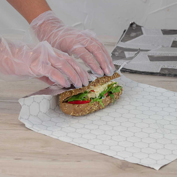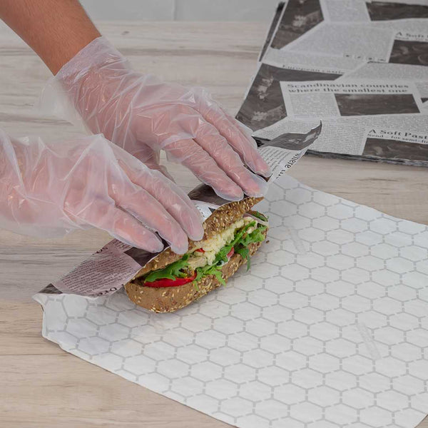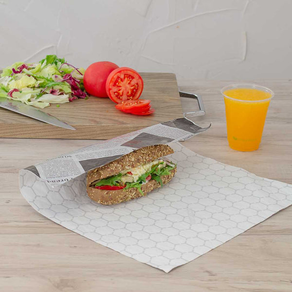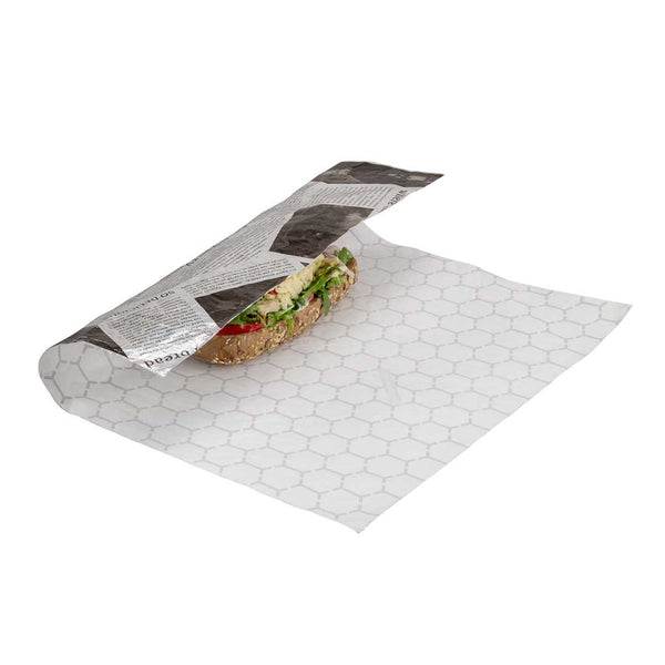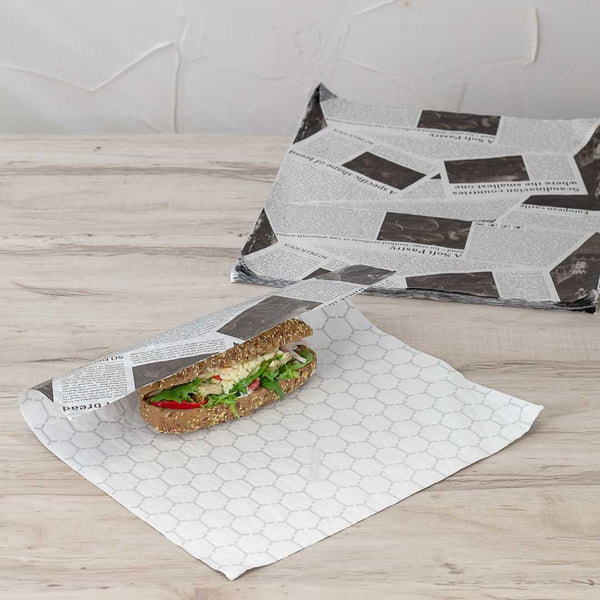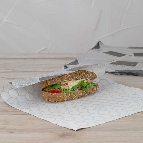 Serve customers tasty burgers or wings using our Foil Lux Newsprint Aluminum Sandwich Wrap Sheets. Made from premium aluminum foil and high-quality paper, these insulated aluminum foil sheets are designed to lock in the heat of meals to keep them fresh and warm. Featuring a grease-resistant lining, these wrap sheets prevent oils and sauces from leaking through to avoid messes. These basket liner sheets have a newsprint design that adds a modern look to meals and elevates food presentations at your restaurant, food truck, or bakery. Ideal for quickly packaging sandwiches, these aluminum foil sheets are conveniently pre-cut so you can skip the hassle of measuring and cutting liners. Great for quick and easy cleanup, these aluminum sandwich wraps are disposable. These foil wrap sheets measure 14 inches in length by 16 inches in width, making them perfect for packing up meals or lining baskets. Sold in a 500 count box.