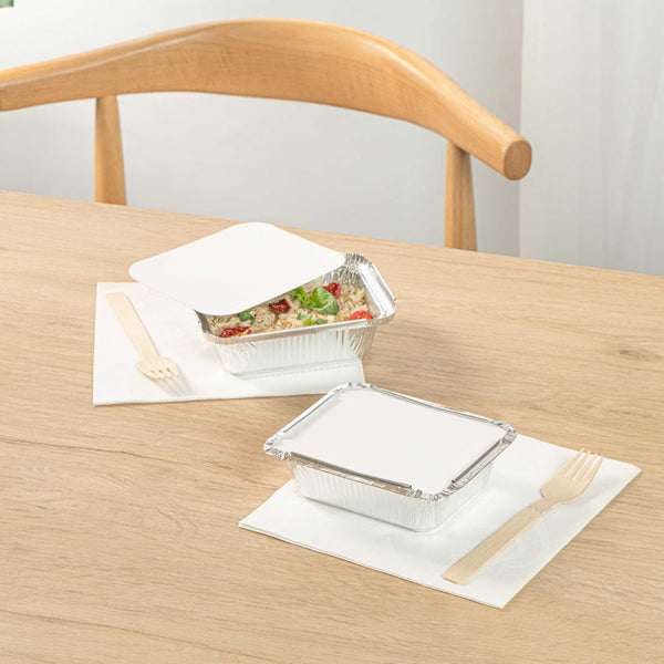 Ensure your meals arrive fresh with secure, contamination-free packaging. Foil Lux White Disposable Foil Lid offers a secure enclosure that perfectly seals compatible containers, maintaining the integrity of your dishes. Constructed from durable foil paper, its foil-laminated side enhances temperature retention, ensuring that your meals remain warm and delicious, making this disposable foil lid indispensable for takeout operations. The plain white board surface allows for easy labeling, providing quick food identification that streamlines kitchen operations. With dimensions of 5.5 inches by 4.5 inches, this aluminum foil lid is designed to fit snugly, offering reliable protection for your culinary creations. Ideal for covering food trays, this food container lid ensures that your offerings remain uncontaminated and presentable during transit. Elevate the efficiency of your foodservice establishment with this essential tool. Sold in a 100 count box.