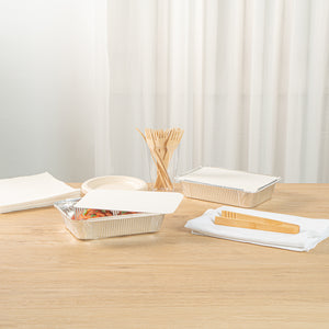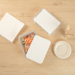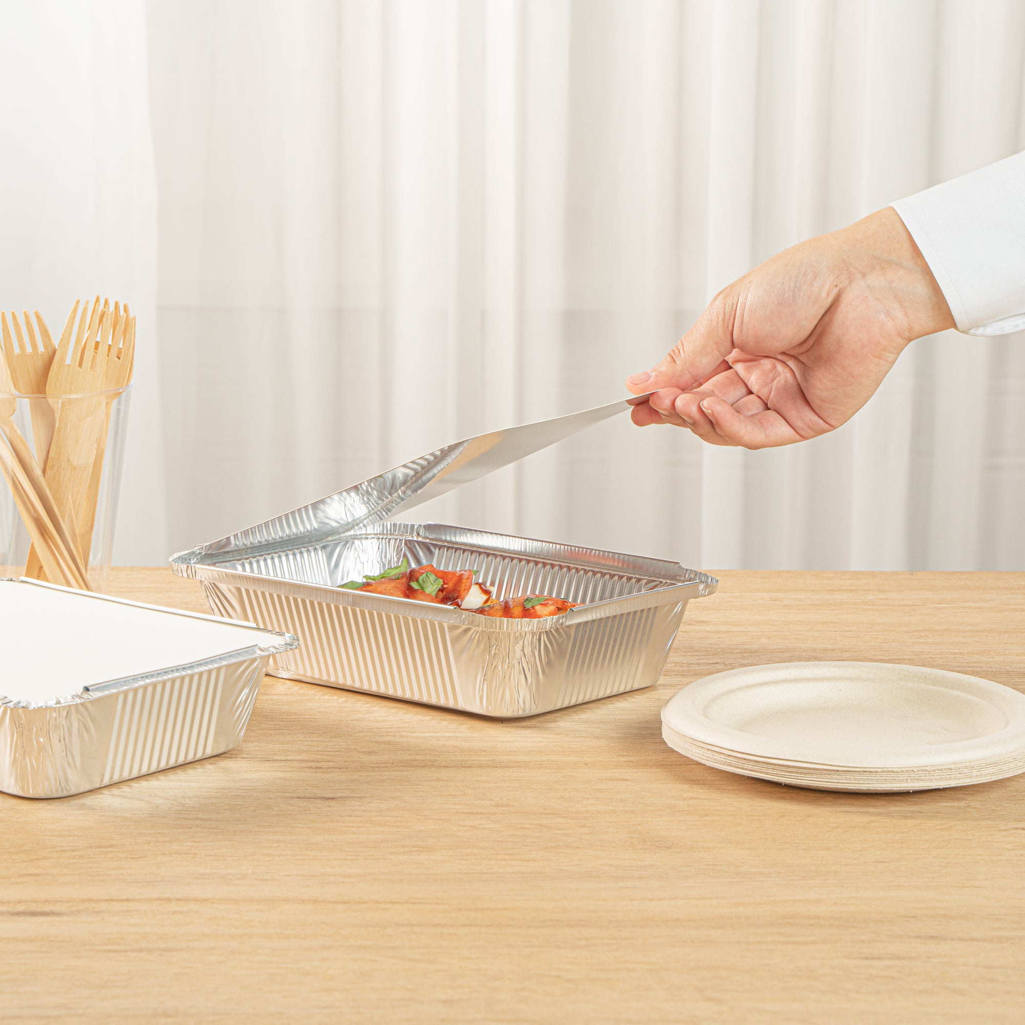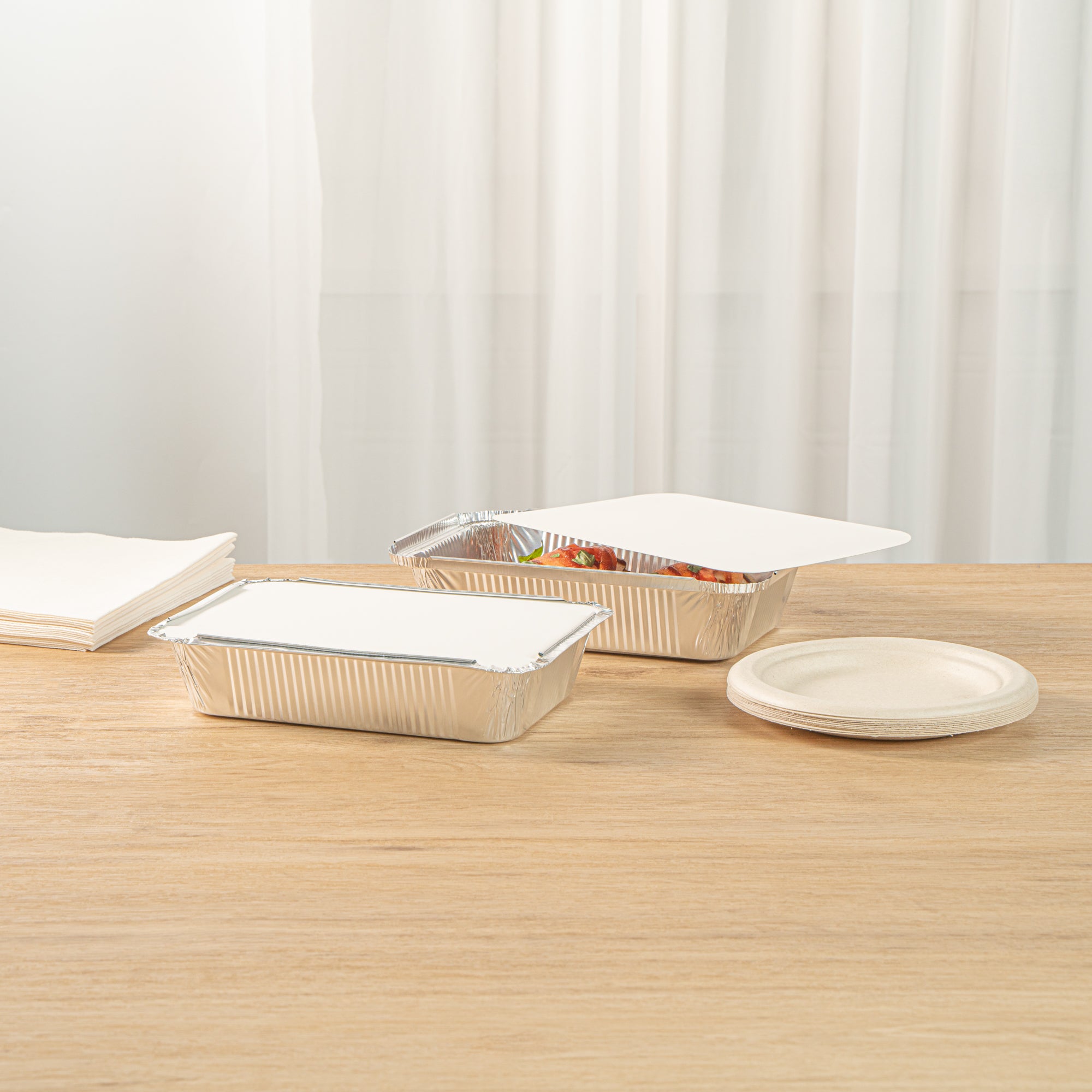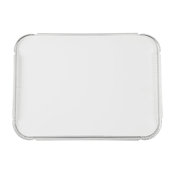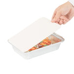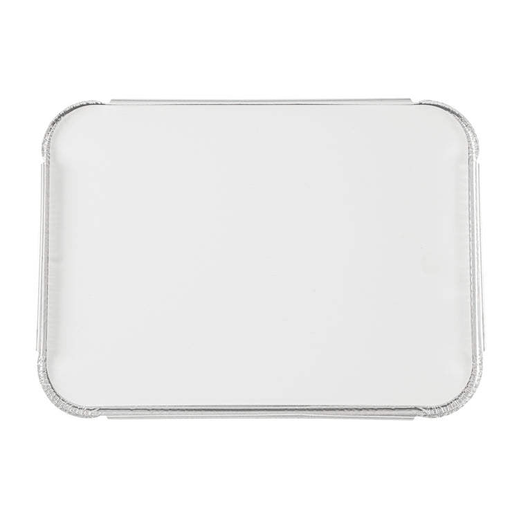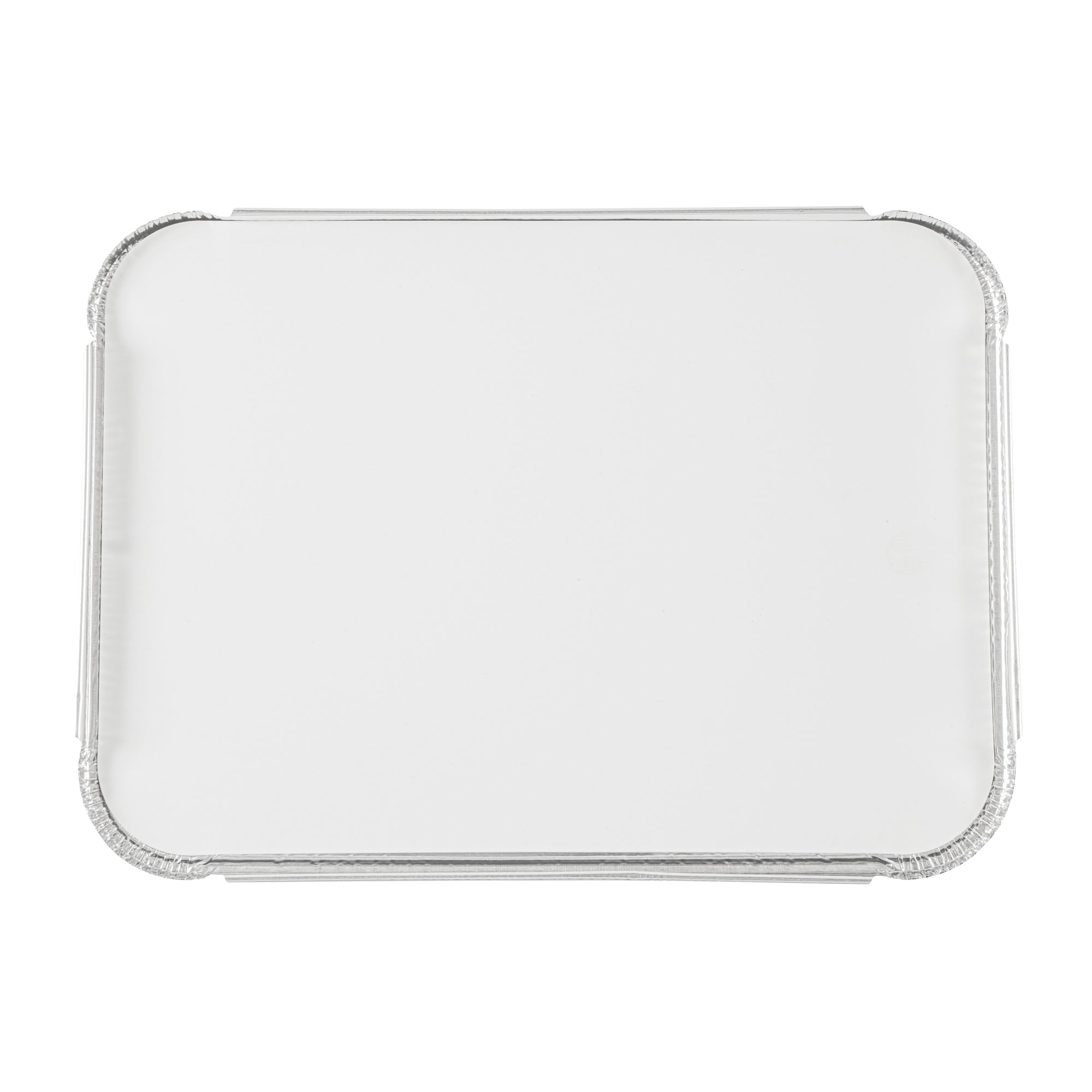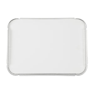 Ensure food safety with secure, reliable coverage. The Foil Lux Disposable Foil Lid securely seals compatible containers to protect your delicious meals from contamination, making it an essential disposable foil lid for busy kitchens. With a foil-laminated side, this lid enhances temperature retention, ensuring that your food remains warm and appetizing, ideal for catering services needing an effective food pan cover. Its plain white board surface allows for quick labeling, streamlining the process of food identification and organization in bustling environments. Crafted from durable foil paper, this lid is 8.4 inches long and 6 inches wide, providing a sturdy and efficient aluminum foil lid solution for your foodservice needs. Elevate your food presentation and ensure quality with these reliable lids. Sold in a 100 count box.
