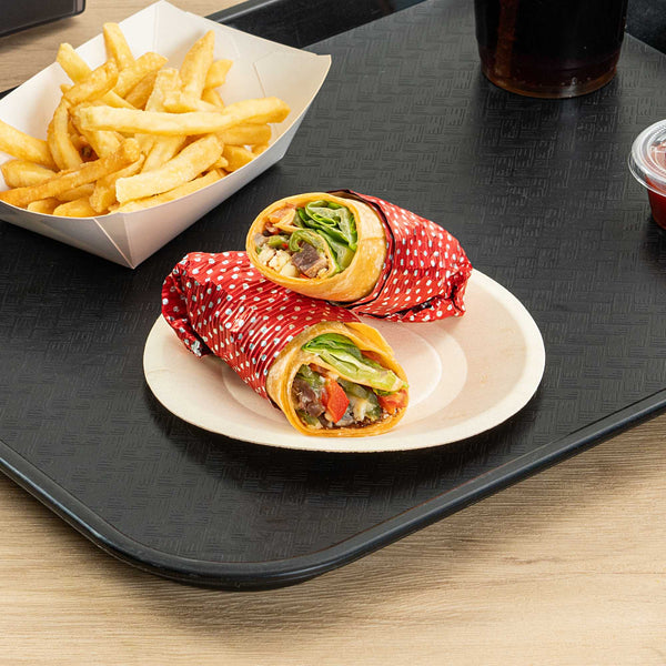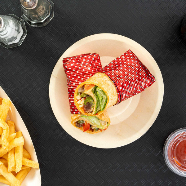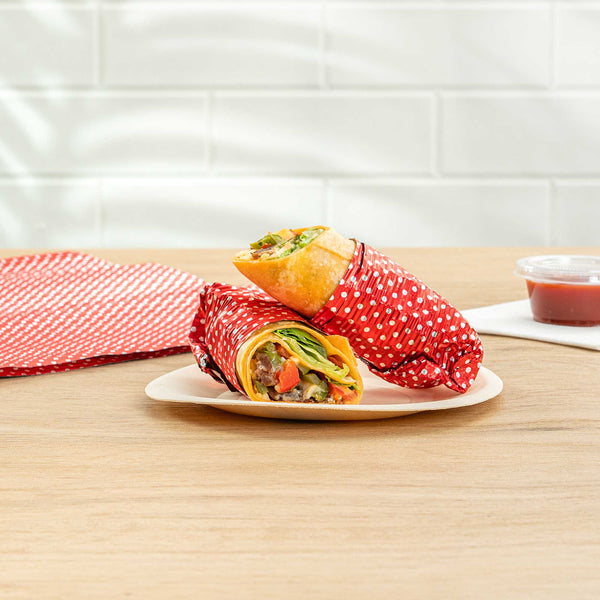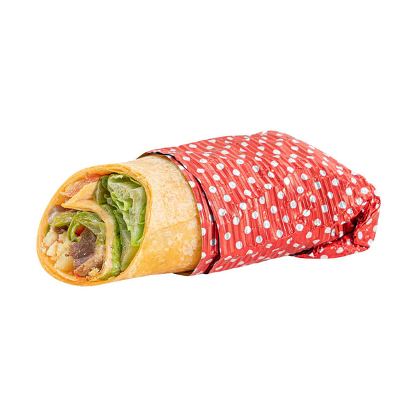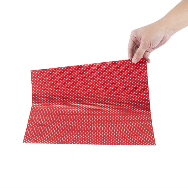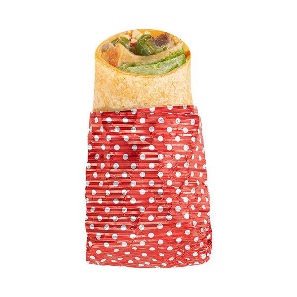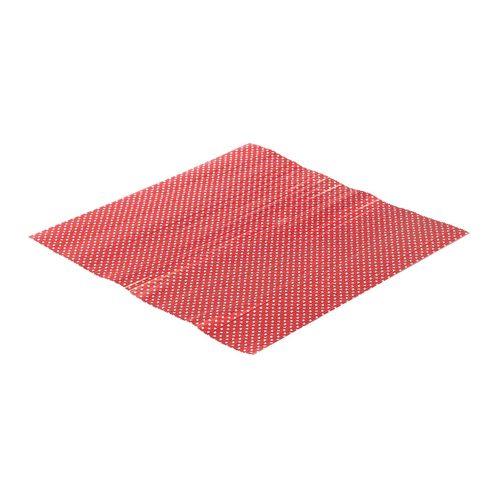 Keep foods fresh and tasty with our Foil Lux Red Polka Dot Ripple Aluminum Wraps and Basket Liners. Use these insulated food wraps to package hot dogs, hamburgers, and gyros -- or use these food-safe aluminum foil sheets to line french fry baskets or tortilla chip baskets. Forget about the hassle of cutting or ripping foil from the box -- these stylish foil wraps are pre-sized and cut into 12 inch x 12 inch squares. Greaseproof, heat-resistant, and freezer-safe, these versatile foil sheets are designed to keep your hot or cold foods delicious and enjoyable. Featuring an eye-catching red and white polka dot design, these rippled foil sandwich wraps are an attractive addition to diners, cafes, and food trucks. Available in bulk 500 count boxes.