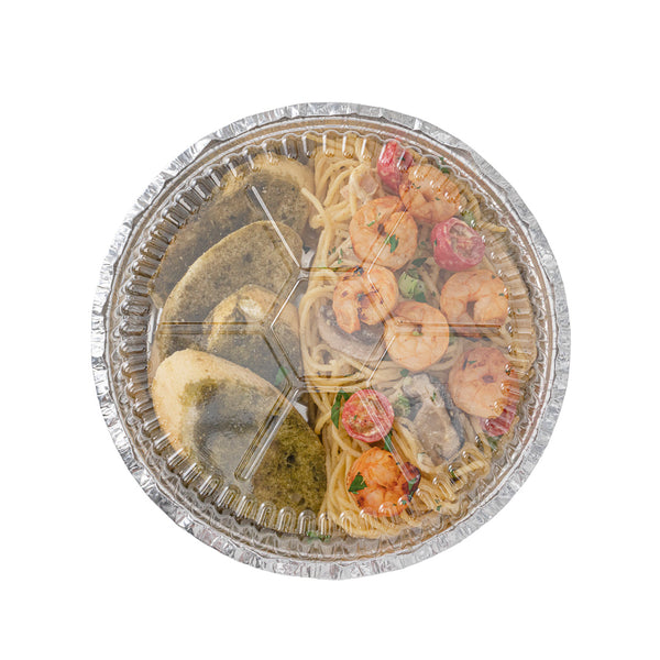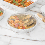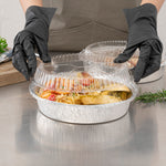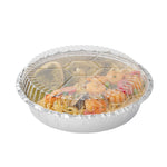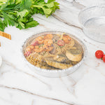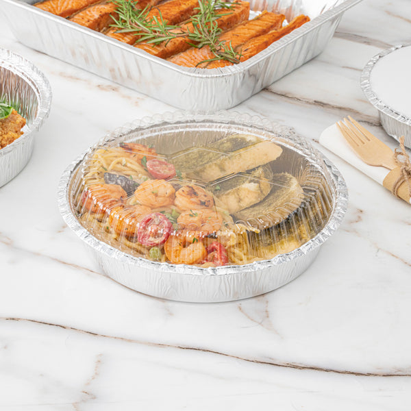 Make transporting catering orders effortless using our Foil Lux Round Clear Plastic Dome Lids. These aluminum foil lids pair perfectly with our 36-ounce aluminum take out pans so you can securely take meals on the go without the risk of spills or messes (SKU: RWM0129S). Made from high-quality plastic, these round foil containers with lids are recyclable for a sustainable and swift way to clean up after use. These pie pans with lids are clear to give guests a sneak peek of their orders. Featuring a domed design, these aluminum foil lids offer an ample amount of space so you can fill containers up with hefty portions and toppings. These round foil containers with lids measure 8 inches in diameter and 1 inch in height. Sold in a 100 count box. Matching take out pans available and sold separately.