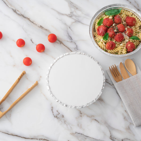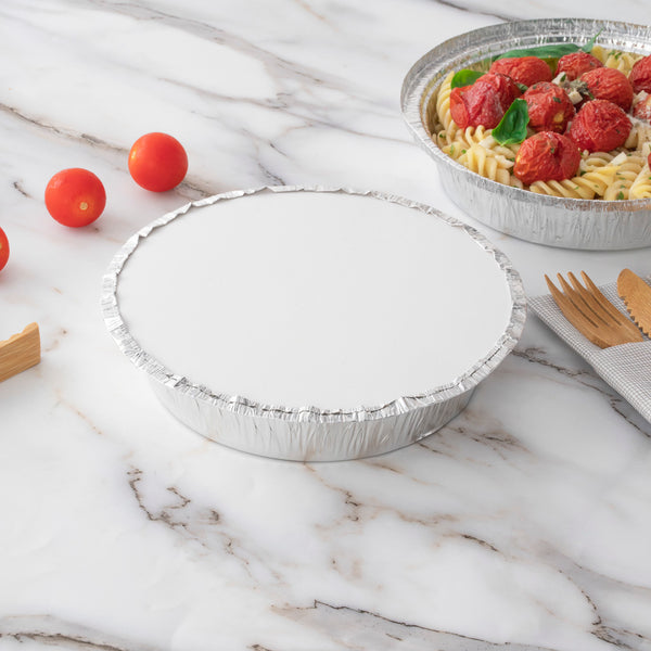 Deliver take out orders in a mess-free manner using our Foil Lux Round White Paper Flat Foil-Laminated Board Lids. These round foil pan lids are made to coordinate with our 24-ounce aluminum take out pans so you can easily package entrees, sides, and desserts for delivery. Crafted from foil-laminated cardboard, these foil bowls with lids feature an interior foil lining that retains heat to keep foods at the perfect temperature before serving. Ideal for easy identification, these foil food containers with lids have a white finish that allows you to label containers or place a sticker on the surface. These round foil pan lids are disposable for easy cleanup. Each foil bowl lid measures 7 inches in diameter. Sold in a 100 count box. Matching take out pans available and sold separately.
