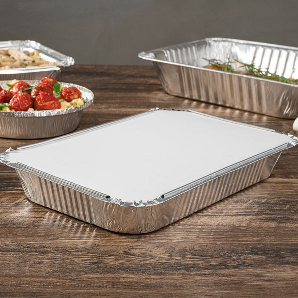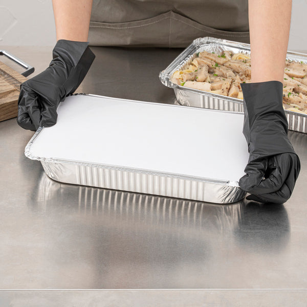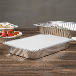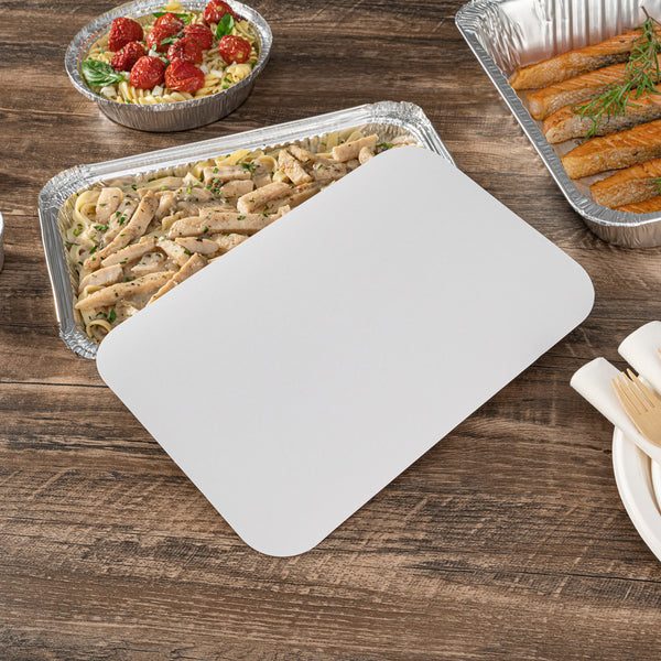Add a layer of protection to take out containers with our Foil Lux White Paper Flat Foil-Laminated Board Lids. Featuring a foil lining on the underside, these flat board lids keep oils from soaking through the lid. Plus, the interior foil lining of these flat board lids for foil containers trap heat to maintain food at ideal temperatures. Compatible with our 4-pound take out containers, these foil laminated board lids are great for carry out and delivery orders. Designed with a classic white finish, these board lids can be written on to label orders and avoid confusion. For an easy cleanup after use, these flat lids are conveniently disposable. These food container lids measure 12 inches long by 8 inches wide. Sold in a 100 count box. Take out containers (search: RWM0125S) are available and sold separately.