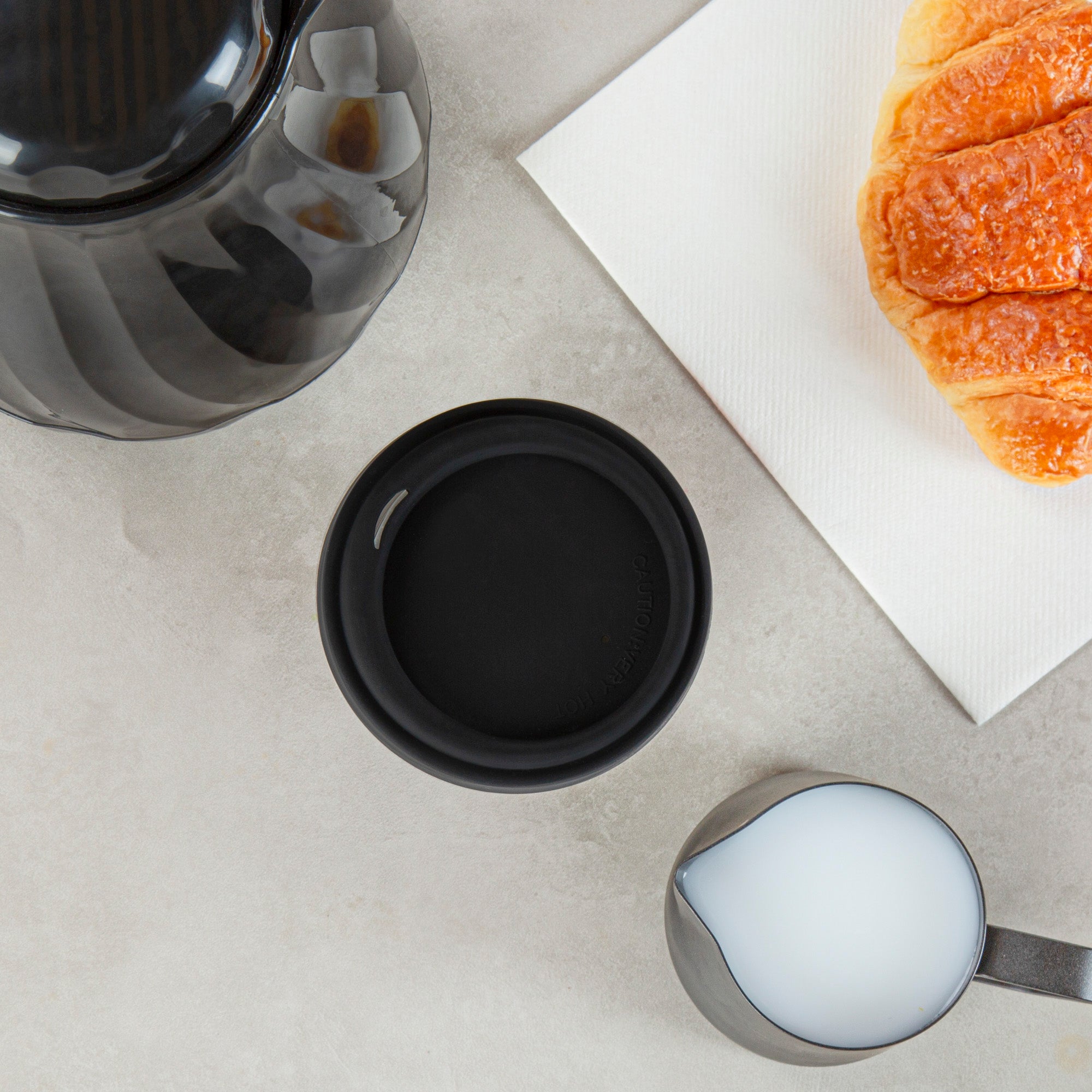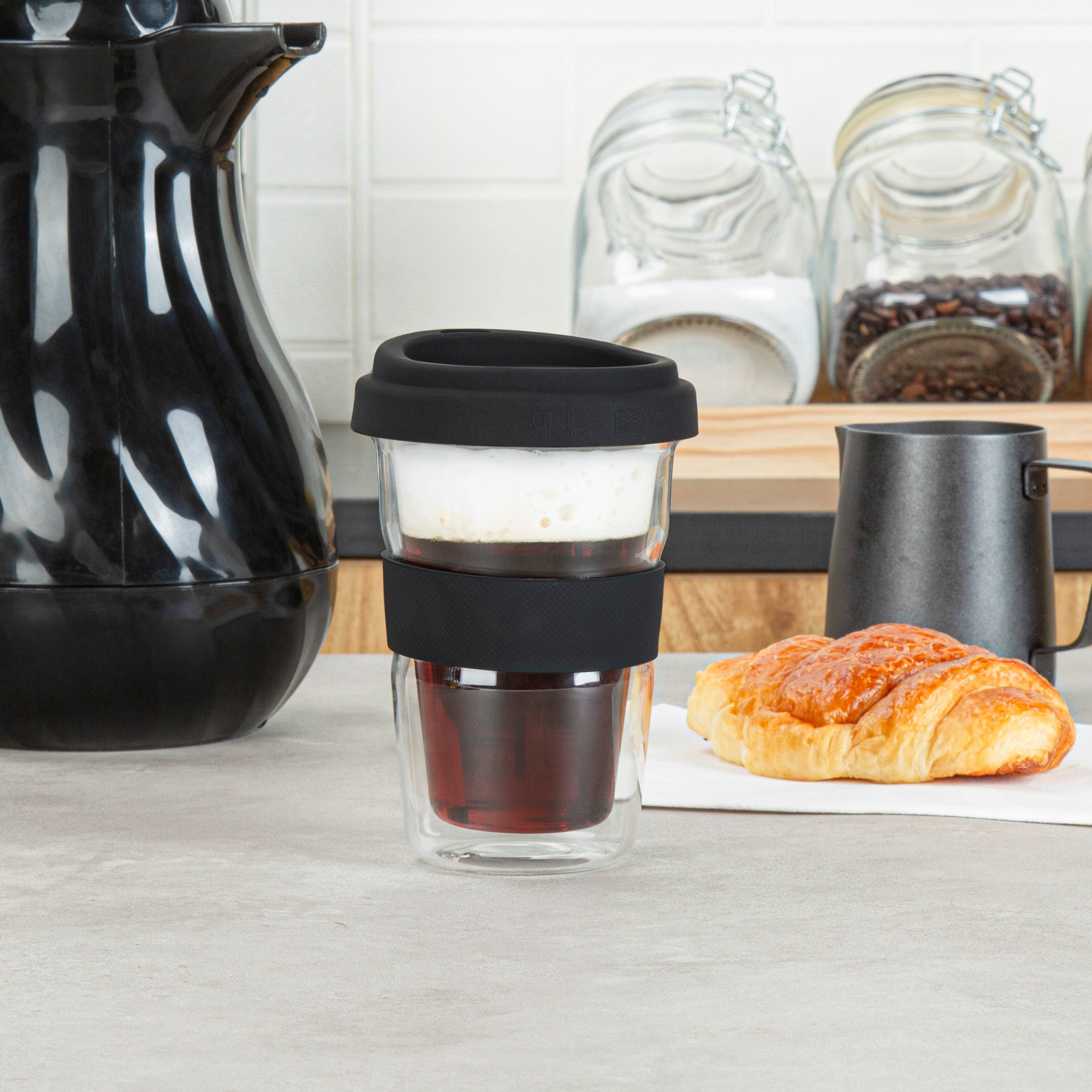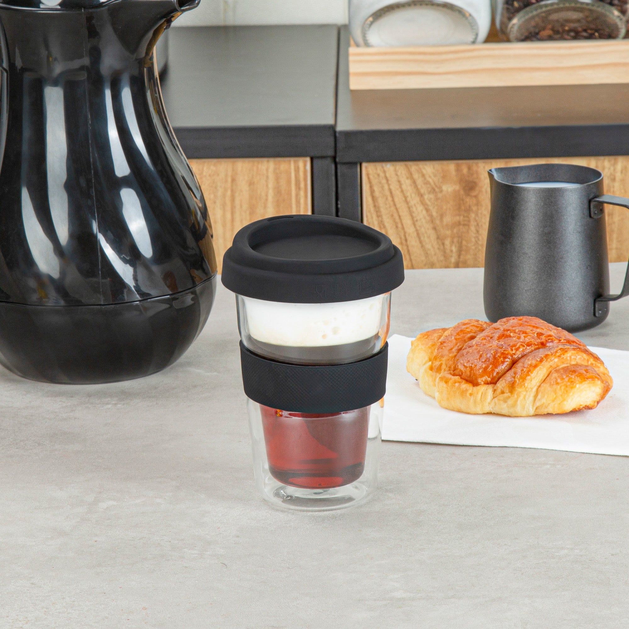 Enhance your beverage service with spill-proof convenience. The Forma Spill-Proof Glass Travel Mug offers a double-wall borosilicate glass construction, ensuring superior insulation to keep beverages hot or cold for extended periods. This glass travel mug features a secure silicone lid that prevents spills during transport, making it ideal for busy coffee shops or on-the-go professionals. With its 14-ounce capacity, it serves standard beverage portions, reducing the need for frequent refills and optimizing service efficiency. The break-resistant glass of this reusable coffee cup withstands daily foodservice operations, offering durability and sustainability by reducing reliance on disposable cups. Its sleek, professional design elevates beverage presentation, aligning with upscale foodservice aesthetics while providing a comfortable grip with the included black lid and sleeve. Each order includes 1 Forma Spill-Proof Glass Travel Mug.