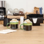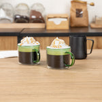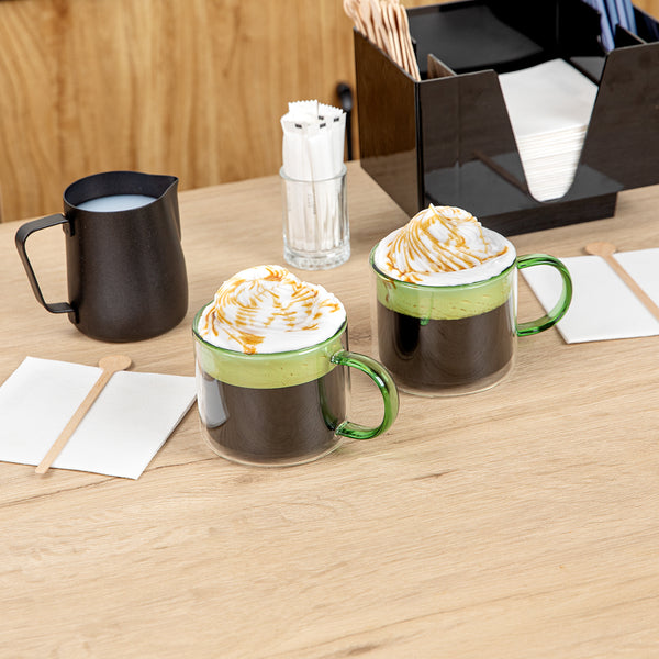 Maintain perfect beverage temperatures with our Forma Professional Double-Wall Glass Mug. This innovative double wall glass mug provides excellent temperature retention, keeping drinks hot or cold for longer periods, ideal for busy cafes and restaurants. Crafted from premium borosilicate glass, it offers remarkable durability and resistance to thermal shock, ensuring it withstands the demands of everyday use as a borosilicate glass mug. Its microwave-safe and dishwasher-safe design streamlines cleanup, making it an efficient choice for any foodservice establishment. Additionally, its freezer-safe capability allows for convenient storage of cold desserts and drinks, enhancing its versatility. With dimensions of 3.5 inches by 3.5 inches by 3 inches, this mug boasts an ergonomic handle for a comfortable grip, reducing the risk of spills during service. Elevate your dining experience with this elegant green mug, perfect for serving hot drinks in style. Each order includes 12 Forma Professional 11 oz Double-Wall Glass Mugs.