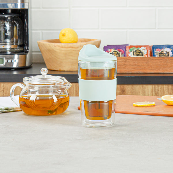 Experience style with our Forma Professional 11.8-ounce Glass Travel Mugs. These travel mugs have a double-wall design that retains temperature. Made from borosilicate glass, these clear coffee mugs do not break easily. These to go coffee cups are durable and can withstand temperatures from -40F to 300F. For enhanced appeal, these coffee tumblers are designed with hand-blown glass. The included silicone lid on our travel coffee mugs forms a tight seal to avoid spills. To minimize drips and dribbles, the lid of these double wall coffee mugs features a raised spout. These travel coffee cups come with silicone cup sleeves to provide a comfortable grip. The mint green finish of these hot cup sleeves and lids adds a pop of color. Made to be versatile, these glass coffee mugs are microwavable and oven-ready. For easy cleaning, these glass tumblers are dishwashable. These glass cups measure 3.1 inches in diameter by 6.3 inches in height and can hold up to 11.8 ounces. Sold in a 10 count box.