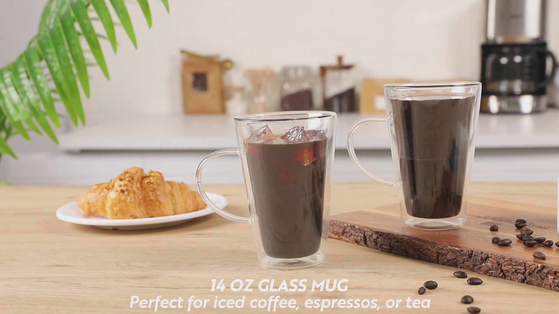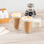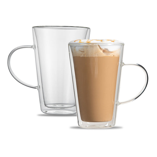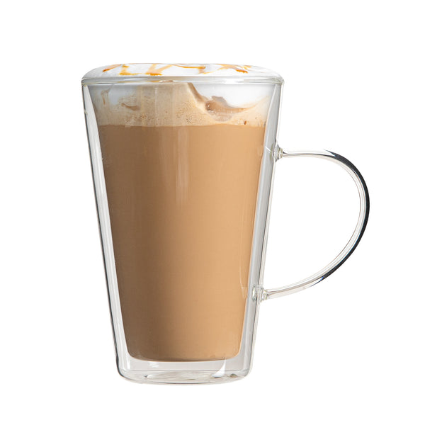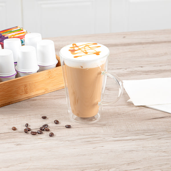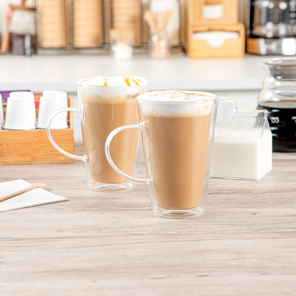 Experience the luxury of sipping beverages in our Forma Professional 14-ounce Glass Mugs. These double wall mugs provide superior insulation, keeping your drinks hot or cold for longer. Crafted from scratch- and break-resistant borosilicate glass, these mugs offer long-lasting durability and elegance. With a handy handle, these glass mugs with handle provide a comfortable and secure grip for savoring your favorite brew. These clear glass mugs elegantly showcase the layered beauty of lattes, teas, or any beverage of your choice. Plus, these borosilicate mugs can withstand temperatures up to 350F, making them ideal for a variety of culinary applications. These glass mugs are dishwashable, making cleanup a breeze, and they can be safely stored in the freezer when needed. Contains up to 14 ounces, these borosilicate mugs measure 4.75 inches in diameter by 5.5 inches in height, making them a stylish and practical addition to any kitchen or cafe. Sold in a 2 count box.