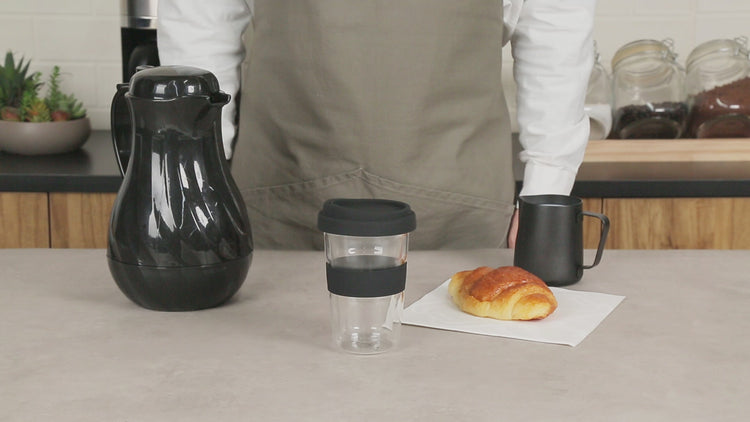 Enhance your beverage service with spill-proof convenience. The Forma Spill-Proof Glass Travel Mug offers a double-wall borosilicate glass construction, ensuring superior insulation to keep beverages hot or cold for extended periods. This glass travel mug features a secure silicone lid that prevents spills during transport, making it ideal for busy coffee shops or on-the-go professionals. With its 14-ounce capacity, it serves standard beverage portions, reducing the need for frequent refills and optimizing service efficiency. The break-resistant glass of this reusable coffee cup withstands daily foodservice operations, offering durability and sustainability by reducing reliance on disposable cups. Its sleek, professional design elevates beverage presentation, aligning with upscale foodservice aesthetics while providing a comfortable grip with the included black lid and sleeve. Each order includes 1 Forma Spill-Proof Glass Travel Mug.