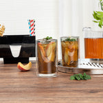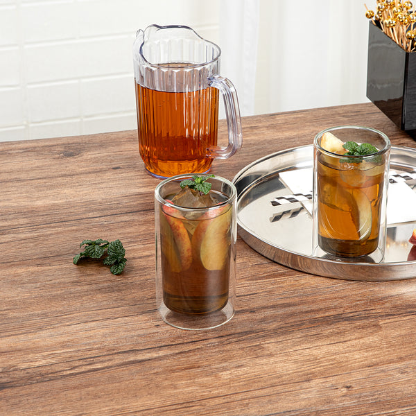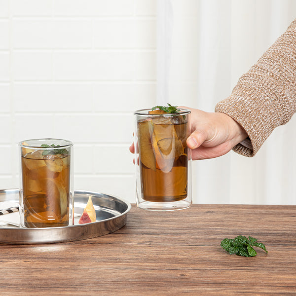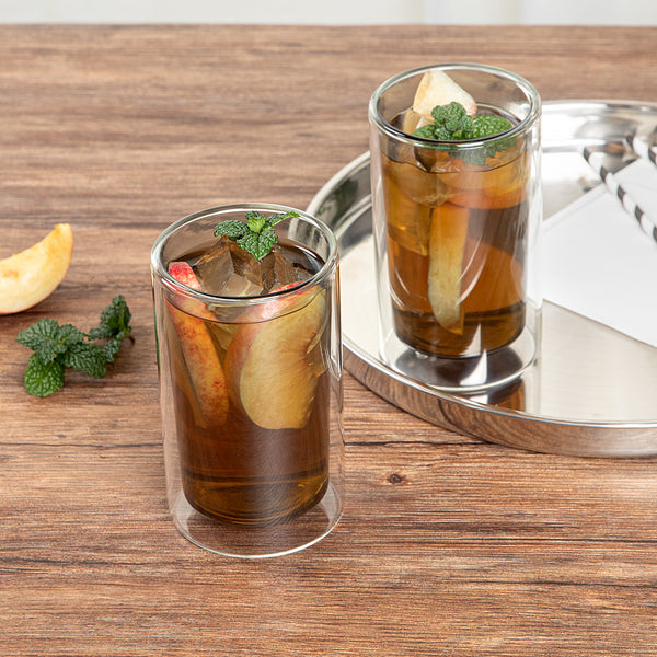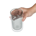 Enhance beverage service with temperature-retaining drinkware. The Forma Professional Insulated Glass Tumbler features a double-wall design, providing exceptional temperature retention for both hot and cold drinks, ensuring customer satisfaction with every sip. Made from premium borosilicate glass, this borosilicate glass tumbler offers durability and resistance to thermal shock, making it ideal for high-traffic foodservice environments. With a 13.6-ounce capacity, it accommodates a variety of beverages, from water to cocktails, offering versatility for diverse menu offerings. The microwave-safe capability of this double wall tumbler simplifies reheating, while its dishwasher-safe design ensures easy and efficient cleaning, reducing labor costs and turnaround time. Measuring 3.15 inches in width and height, it boasts a sleek gray tint that adds a modern aesthetic to any table setting. Each order includes 2 Forma Professional Insulated Glass Tumblers.