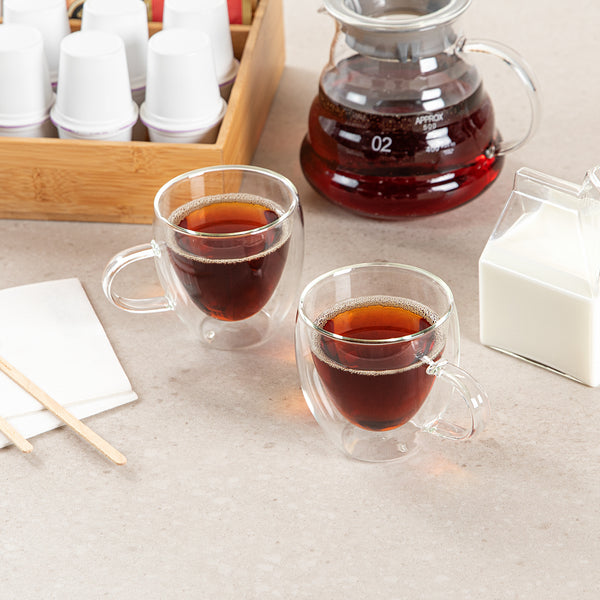 Enhance beverage service with superior insulation and presentation. The Forma Professional Insulated Glass Espresso Cups feature a double-wall design that expertly retains the temperature of your hot beverages while ensuring the exterior remains cool to the touch, which is vital for customer comfort and safety. Crafted from borosilicate glass, these glass espresso cups are both durable and resistant to thermal shock. Their microwave and freezer compatibility allow for flexible preparation and storage options, providing versatility for busy cafés. With a 2.6-inch length, these double wall glass cups boast an ergonomic handle design that facilitates easy handling, reducing the risk of spills during service. Additionally, the dishwasher-safe glass simplifies cleaning and maintenance, saving valuable time and labor costs. Each order includes 12 Forma Professional Insulated Glass Espresso Cups.