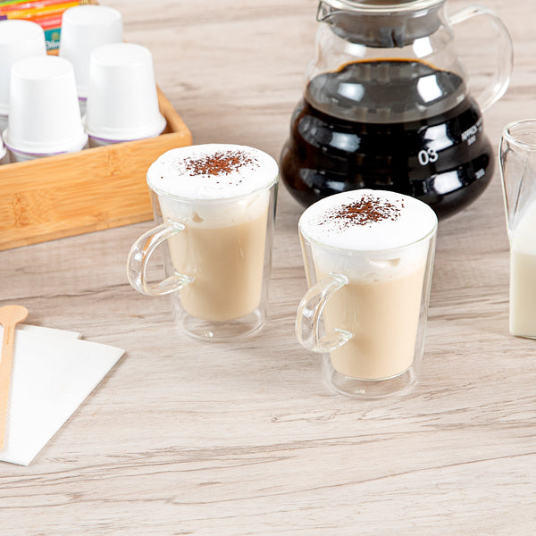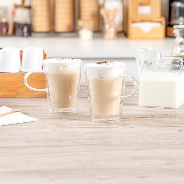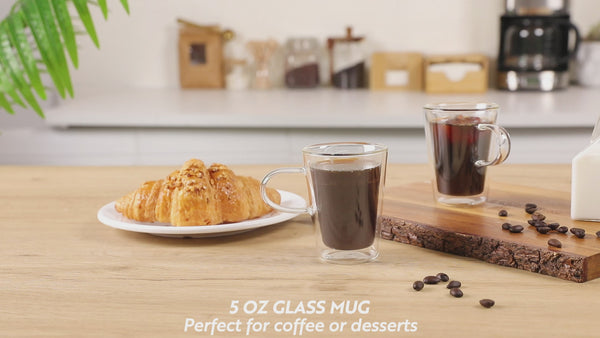 Enhance your dining experience with our Forma Professional 5-ounce Glass Mugs. Built with double-walled insulation, these glass mugs are designed to keep your hot drinks hot and your cold drinks cold for longer periods. Crafted from scratch and break-resistant borosilicate glass, these mugs with handle can withstand the daily rigors of any busy kitchen. These borosilicate mugs offer a clear finish that allows for a full visual appreciation of your beverages. Designed to withstand heat up to 350F, these double wall mugs are suitable for hot and cold beverages, making them a versatile addition to your kitchenware. Conveniently dishwashable, these glass mugs with handle offer easy cleanup, saving you valuable time. These clear glass mugs can also be used in the freezer, providing flexibility for your beverage chilling needs. With a capacity of 5 ounces, these mugs measure 2.75 inches in diameter by 3.75 inches in height and are perfect for serving espresso shots, mini desserts, or other small portions. Sold in a 2 count box.