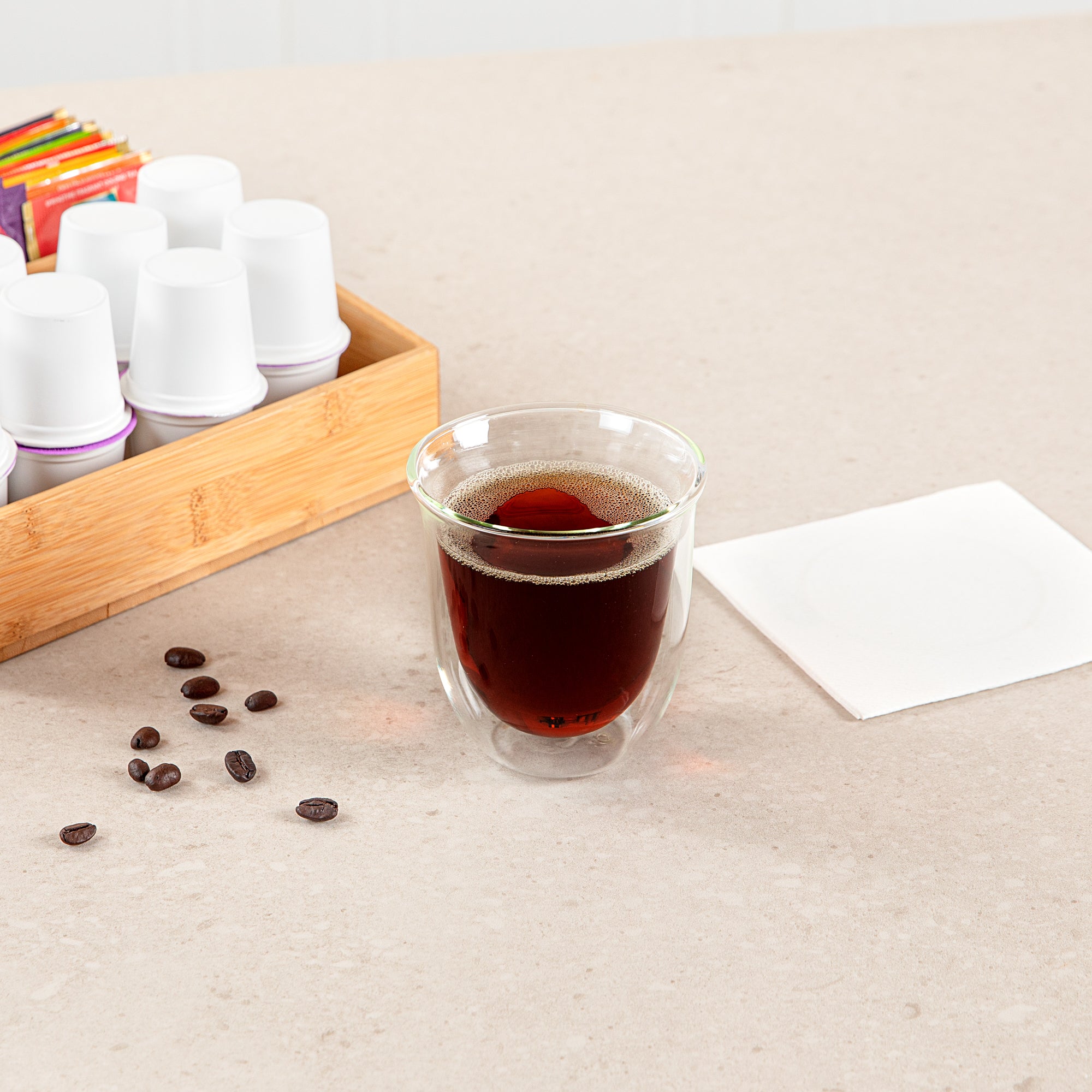 Enhance beverage service with expertly designed drinkware. The Forma Professional Double-Wall Insulation Double Wall Coffee Cup combines a sleek 3.5-inch round shape with a double-wall design to keep beverages hot or cold longer, ensuring guest satisfaction with consistent temperatures. Crafted from borosilicate glass, this cup resists thermal shock, making it a durable choice for foodservice professionals who need a borosilicate glass cup that can handle both hot and cold beverages seamlessly. Its 6.8-ounce capacity is perfect for standard coffee servings, and its microwave and freezer compatibility make preparation and storage processes more efficient The reusable coffee cup is also dishwasher safe, minimizing cleaning time and labor costs, allowing staff to focus on enhancing the customer experience. Invest in quality and operational efficiency with this versatile coffee cup. Each order includes 2 Forma Professional Double-Wall Insulation Double Wall Coffee Cups.
