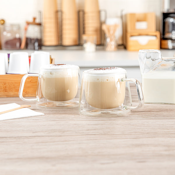 Elevate your beverage service with our Forma Professional 7-ounce Glass Coffee Mugs. These double walled coffee mugs are expertly designed to keep drinks at their optimal temperature, whether hot or cold, enhancing the drinking experience for your customers. Incorporated with a handy handle, these coffee mugs with handle ensure a secure and comfortable grip, offering convenience and style. Constructed from borosilicate glass, these coffee mugs are scratch- and break-resistant, ensuring long-lasting use for your establishment. Capable of withstanding temperatures up to 350F, these glass coffee mugs with handle are perfect for serving hot drinks. For added convenience, these coffee glasses are dishwasher-safe, enabling quick and easy cleaning for your staff. These glass coffee mugs are also freezer-safe, providing the flexibility to prepare and store cold beverages. With a capacity of 7 ounces, these microwavable coffee mugs with handle are ideal for serving the perfect portion of coffee, tea, or other hot beverages. Measuring 3.75 inches in diameter by 2.75 inches in height, these borosilicate coffee mugs are compact and easy to store, making them a space-efficient choice for your establishment. Sold in a 2 count box.