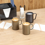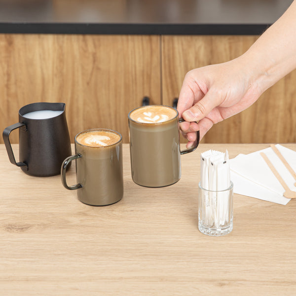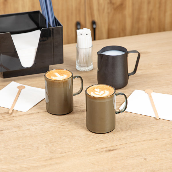 Enhance your beverage service with expertly-designed drinkware. Forma Professional Glass Coffee Mug delivers exceptional durability and thermal resistance with its borosilicate glass construction, ensuring long-lasting performance in high-traffic foodservice environments. This sleek glass coffee mug features a 7-ounce capacity, perfect for serving standard portions and minimizing waste while accommodating customer preferences. The double wall glass mug is paired with an ergonomic handle that offers a sturdy grip, providing comfort and safety when serving hot beverages. Additionally, its microwave-safe design allows for quick reheating, enhancing operational efficiency. With dimensions of 2.5 inches by 2.5 inches by 3.5 inches, this mug fits effortlessly into any table setting, adding a modern touch with its sleek gray finish. Ideal for cafés, restaurants, and hotel room service, this microwave-safe coffee mug elevates presentation. Each order includes 2 Forma Glass Coffee Mugs.