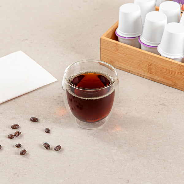 Keep beverages at the perfect temperature with these elegant double wall coffee cups. The Forma Professional Double-Wall Insulation Double Wall Coffee Cup features a double-wall design that maintains the ideal temperature for both hot and cold drinks, ensuring comfort with a cool-to-touch exterior. Constructed from durable borosilicate glass, this glass coffee cup withstands thermal shock, making it suitable for versatile service in cafes and restaurants. Its microwave and freezer compatibility enhances preparation and storage flexibility, while its 3.3-inch by 3.3-inch by 3.5-inch size provides an 8.4-ounce capacity, perfect for standard coffee servings. As a dishwasher-safe reusable coffee cup, it significantly reduces cleaning time and labor, streamlining back-of-house operations. Enhance your beverage service with these sleek, transparent cups that add a modern touch to any setting. Each order includes 12 Forma Professional Double-Wall Insulation Double Wall Coffee Cups.