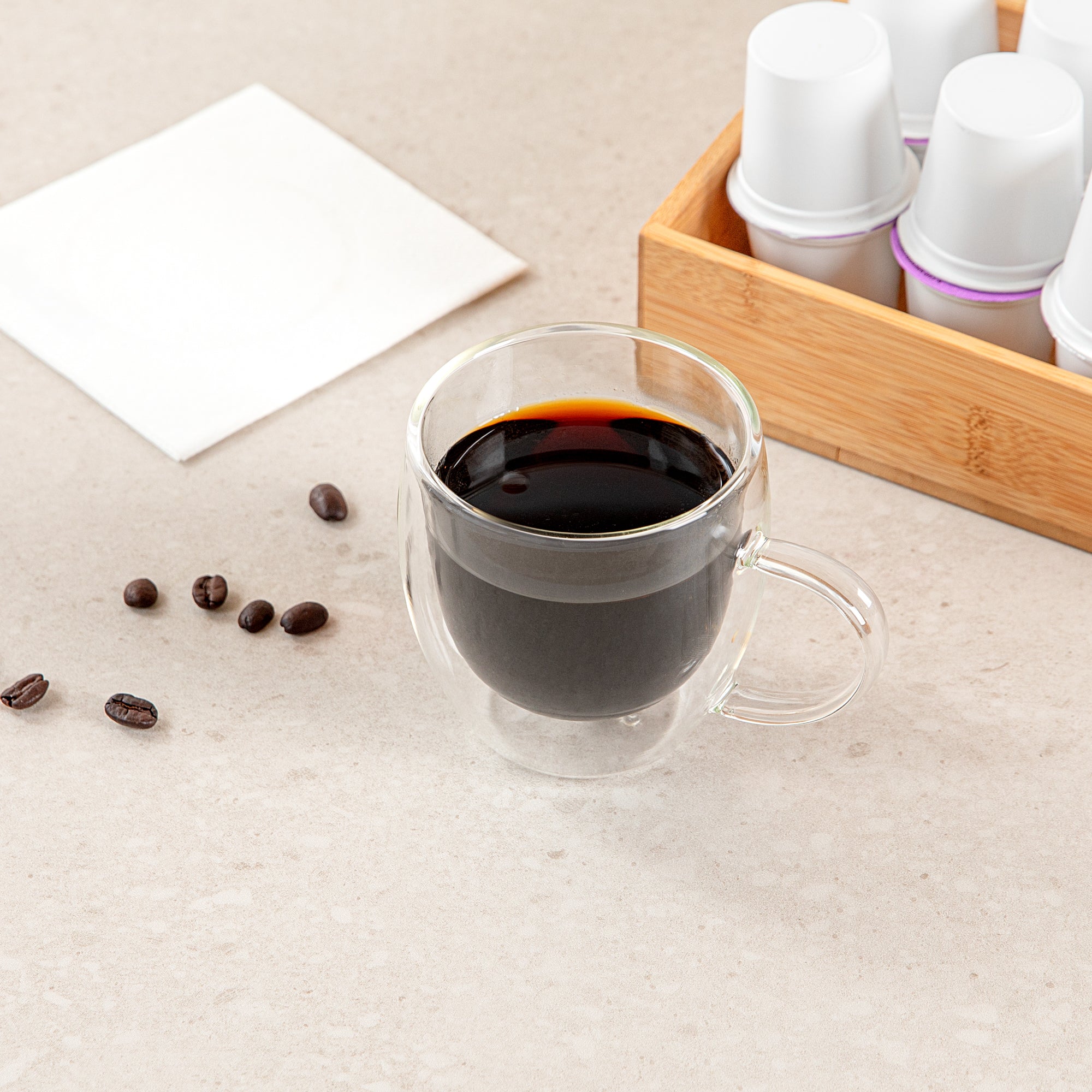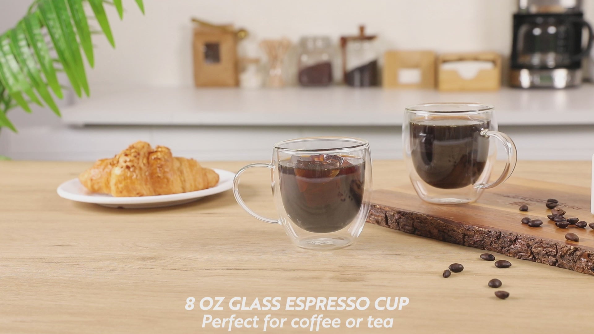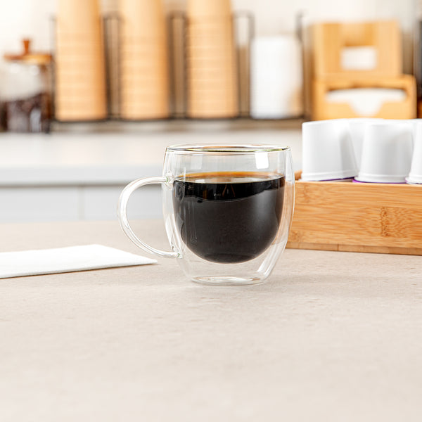 Experience coffee in a whole new light with our Forma Professional 8-ounce Glass Coffee Cups. Made from scratch and break-resistant borosilicate glass, these coffee glasses offer durability and style for your beverage service. These double-wall glass coffee cups provide insulation, ensuring that your drinks stay hot or cold longer without the exterior becoming uncomfortable to the touch. These borosilicate coffee cups also have the unique ability to withstand temperatures up to 350F, making them oven and microwave-safe. Dishwasher-safe and freezer-safe, these clear coffee cups offer ultimate convenience for both preparation and cleaning. With a handle for ease of use, these glass coffee cups have a handle design that is a standout feature that ensures comfort and safety while handling hot beverages. Serving up to 8 ounces of your favorite brew, these coffee glasses measure 3 inches in diameter by 3.5 inches in height, making them the perfect size for a satisfying cup of coffee. Sold in a 2 count box.