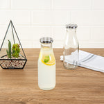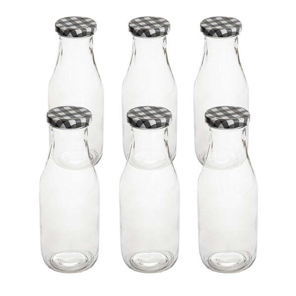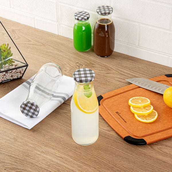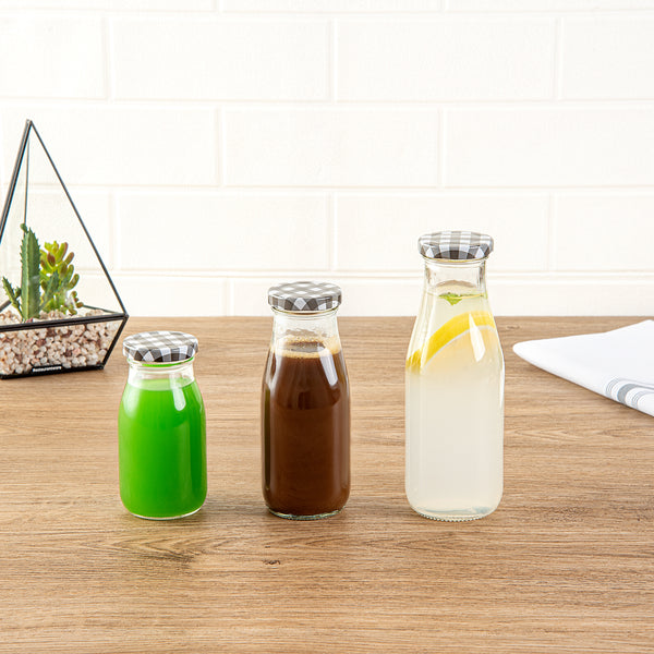 Elevate your drink presentation with our French Countryside 15-ounce Glass Bottles. Engineered for durability, these glass bottles showcase a robust structure, effectively standing up to daily usage demands. The airtight cap of these countryside glass bottles is elegantly accented with a black plaid pattern, ensuring freshness and a secure seal. Designed to cater to both hot and cold beverages, these clear glass bottles complement your diverse drink preferences. Crafted from resilient glass, these milk bottles align with sustainable practices, and their microwavable and dishwashable attributes simplify meal preparation and cleanup. Featuring a 6-ounce capacity and dimensions of 2.5 inches in diameter by 7.5 inches in height, these glass juice bottles embody both sophistication and practicality. Shipped in a 10 count box.