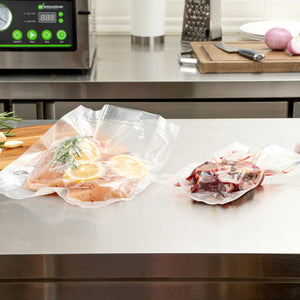 These vacuum sealer food saver bags and pouches can be submerged in hot water for thawing or sous vide cooking. Easily prep or cook stored food!