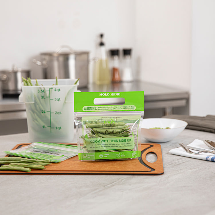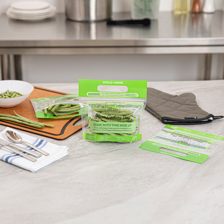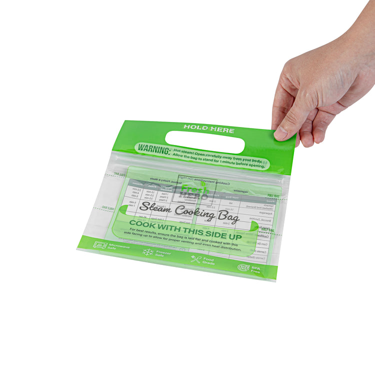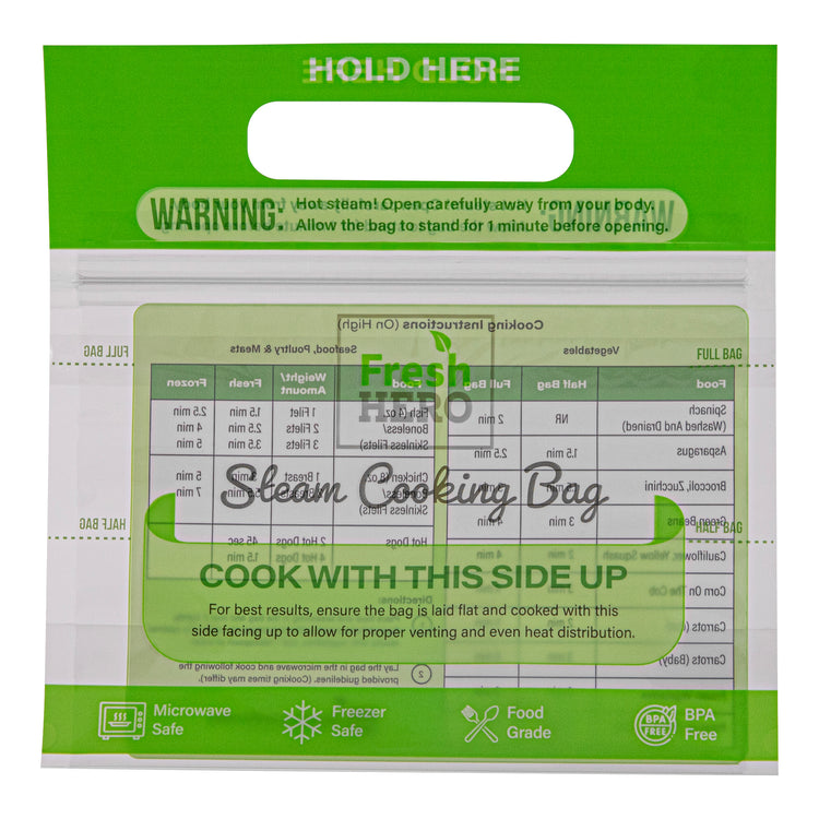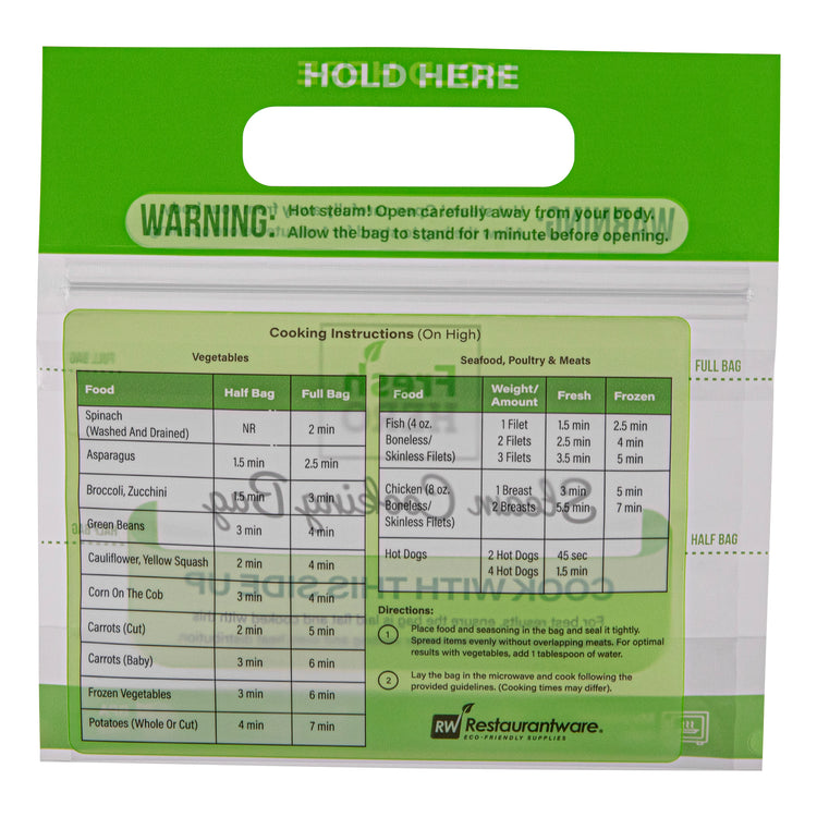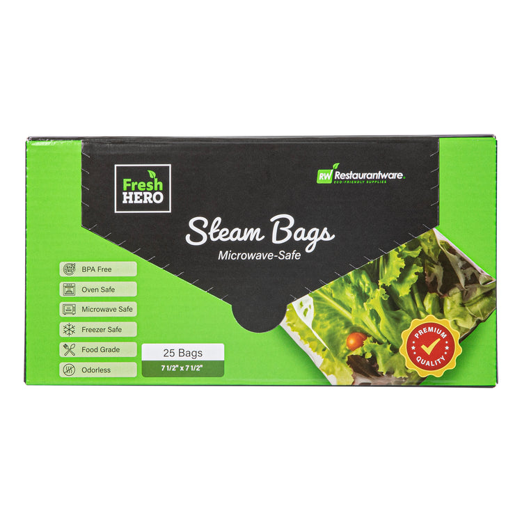 Streamline your kitchen operations with versatile microwave steam bags. Fresh Hero Plastic Microwave Steam Bags, crafted from BPA-free plastic, ensure safe cooking for all foods, eliminating harmful chemicals and aligning with health-conscious foodservice practices. These steam cooking bags are compatible with both microwave and oven applications, allowing caterers and quick-service restaurants to employ versatile cooking methods that save time and enhance efficiency. The 7.5 x 7.5-inch size is perfect for individual portions, reducing waste and controlling portion sizes, especially useful for meal prep businesses. With their green color, these disposable steam pouches add a visually appealing touch to takeout and delivery services. Plus, their recyclable and disposable nature ensures an eco-friendly cleanup, making them an ideal choice for sustainable operations. Each order includes 500 Fresh Hero Plastic Microwave Steam Bags.