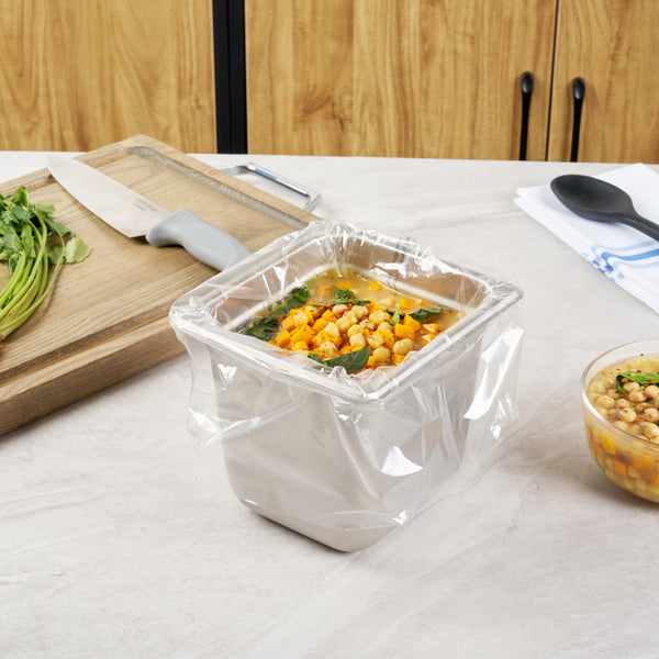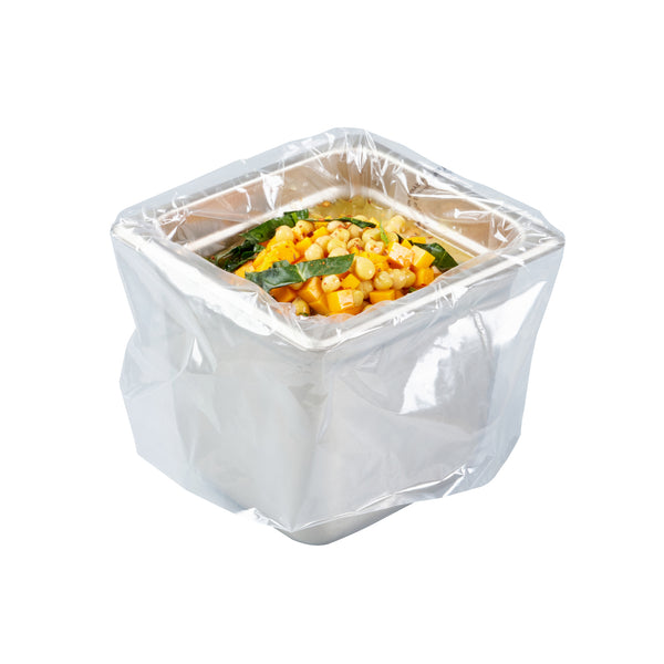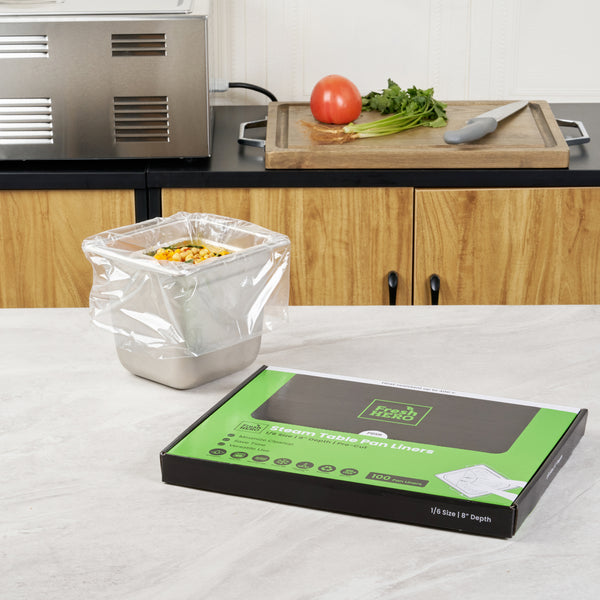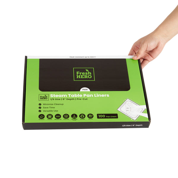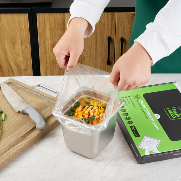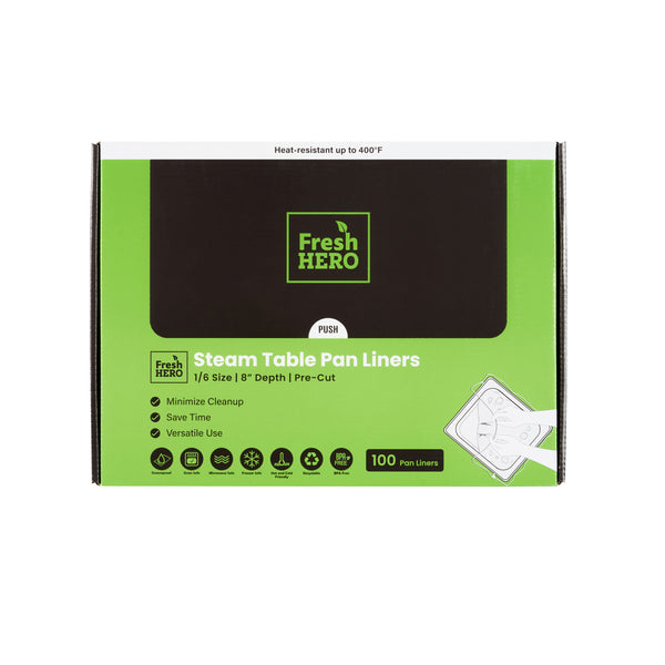 Ensure effortless cleanup with greaseproof protection. Fresh Hero Contour-Fit Steam Table Pan Liners feature a unique Contour-Fit® design that prevents food from getting trapped in corners, enhancing operational efficiency and reducing food waste. These disposable pan liners have a greaseproof surface that makes cleanup quick and easy, significantly decreasing labor time and costs for busy kitchens. Made from durable plastic, these liners are microwave-safe, freezer-safe, and oven-safe, maintaining food quality and yield during service. Measuring 13 inches in length and 18 inches in width, they fit seamlessly into most standard steam table pans, providing a reliable barrier against moisture loss and contamination. Save on operating costs by reducing water use and avoiding strenuous scrubbing. Elevate your food safety standards and streamline meal prep with these exceptional steam table pan liners. Each order includes 100 Fresh Hero Contour-Fit Steam Table Pan Liners.