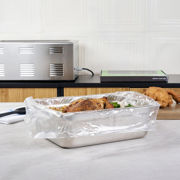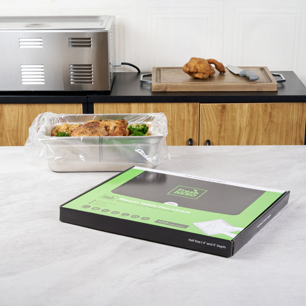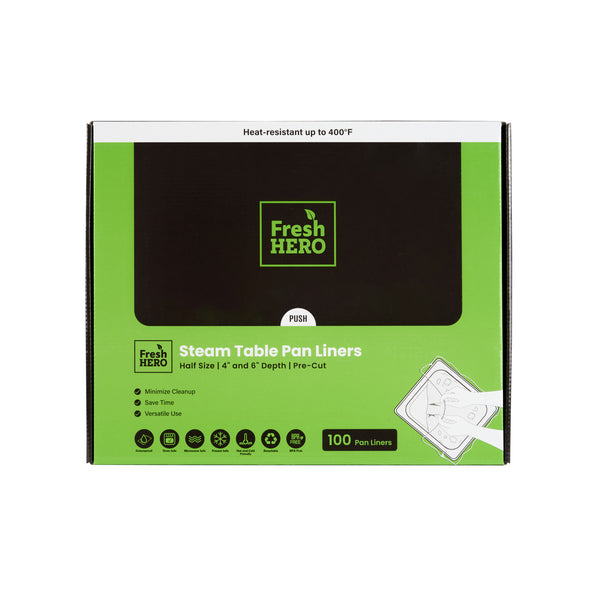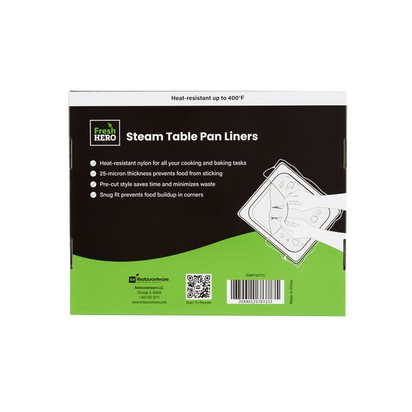 Streamline kitchen efficiency with labor-saving steam table pan liners. Fresh Hero Contour-Fit Steam Table Pan Liners feature a unique Contour-Fit® design that prevents food from getting lost in the liner corners, ensuring every dish is served at its best. These disposable pan liners have a greaseproof surface that increases food yield by preventing sticking, making them ideal for busy foodservice operations. Constructed from durable plastic, these liners are microwave-safe, freezer-safe, and oven-safe pan liners, providing versatility across various cooking methods. Measuring 23 inches in length and 14 inches in width, they fit standard steam table pans perfectly and make cleanup a breeze by eliminating the need for scrubbing, thus saving time and labor costs. Enhance food safety by minimizing surface contamination risks, and reduce operating expenses by conserving water. Each order includes 100 Fresh Hero Contour-Fit Steam Table Pan Liners.