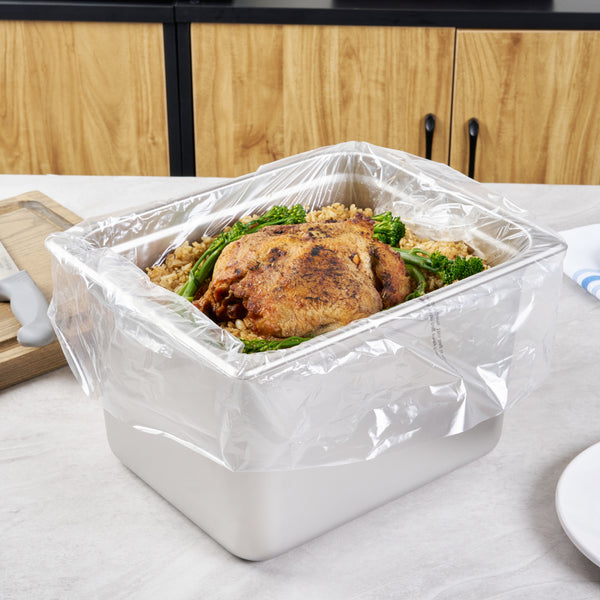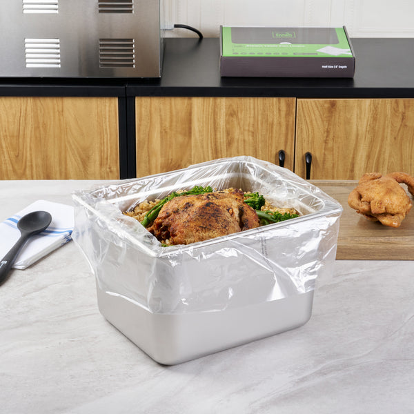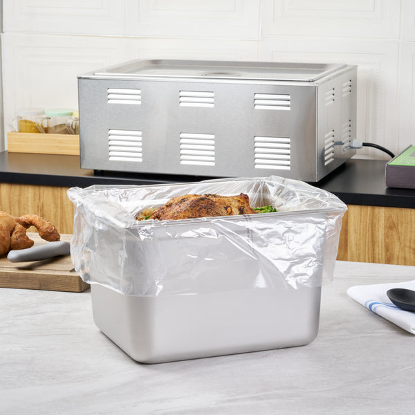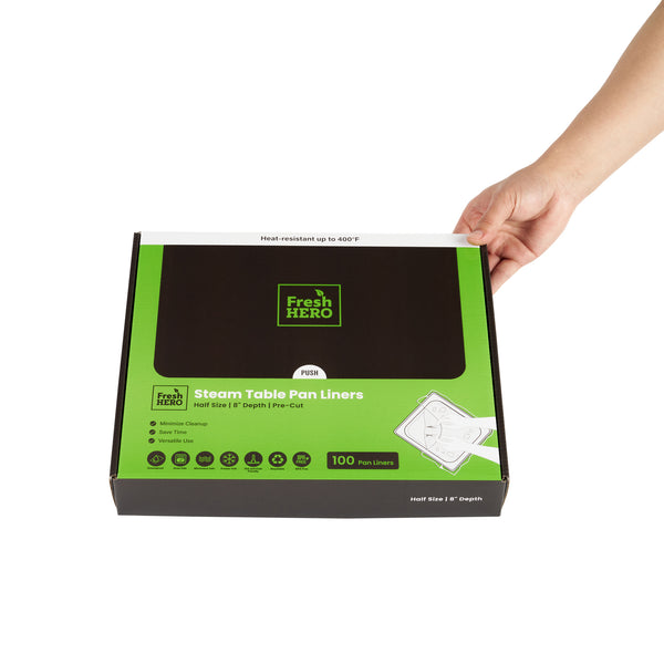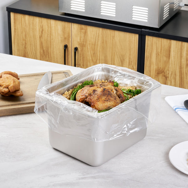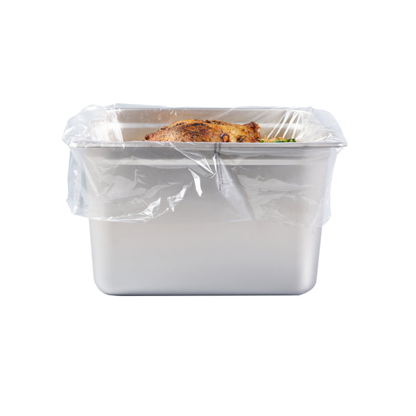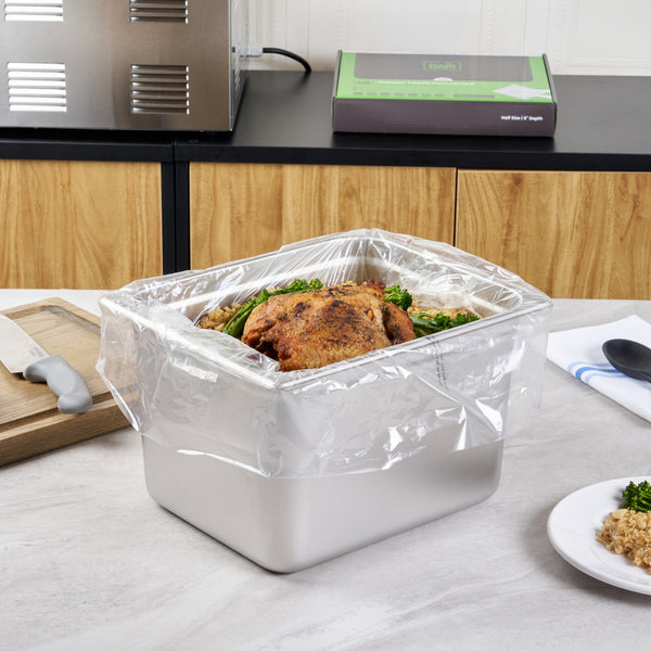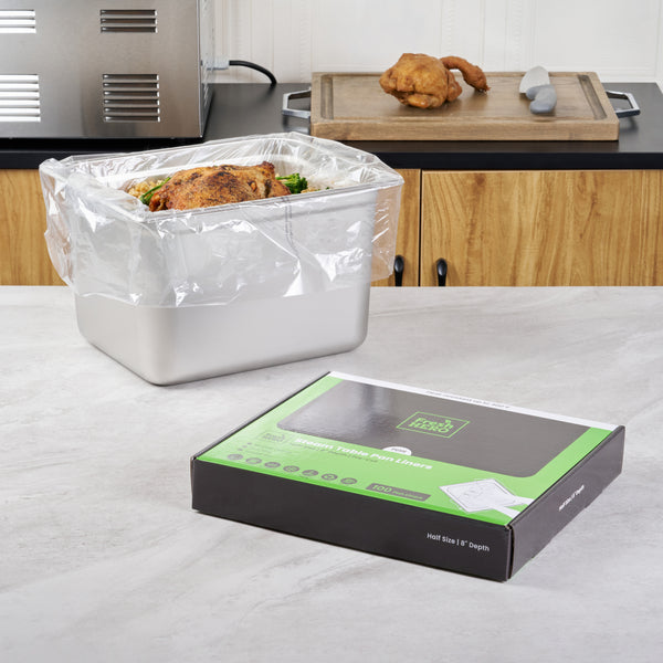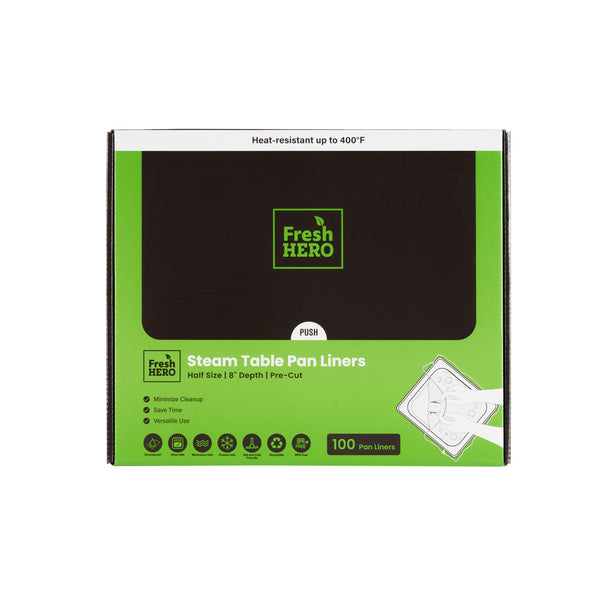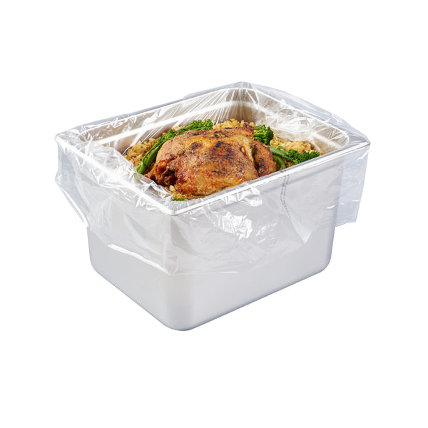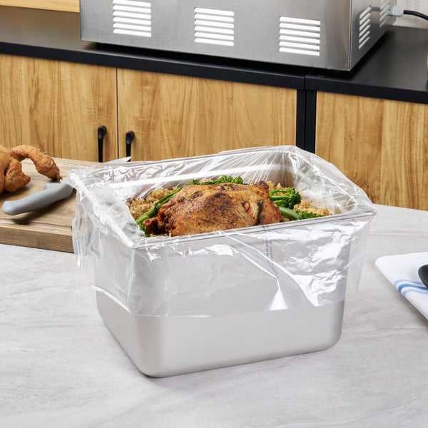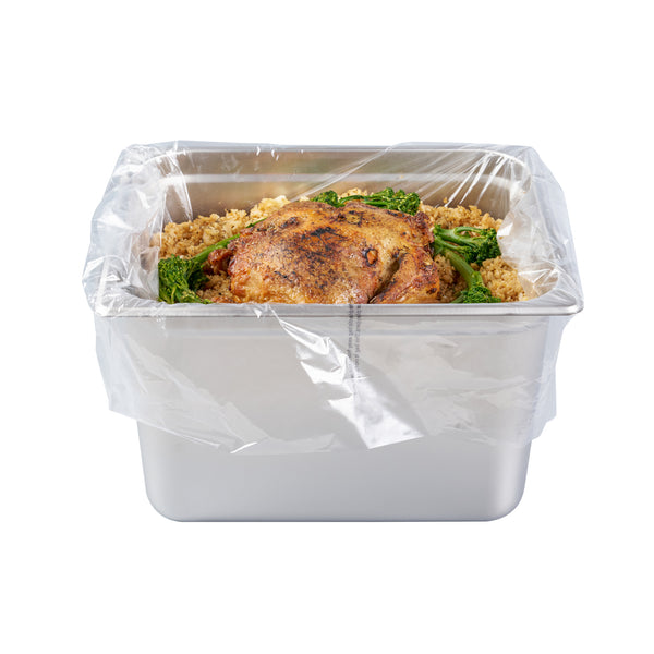 Maximize kitchen efficiency with easy-to-clean disposable steam pan liners. Fresh Hero Contour-Fit Disposable Steam Pan Liners are designed with Contour-Fit® technology, ensuring food doesn’t get lost in corners, which saves labor and time. The greaseproof surface eliminates the need for scrubbing, allowing for quick and easy cleanup, while the oven-safe design retains moisture to improve food quality. These versatile oven-safe pan liners, measuring 23 inches in length and 18 inches in width, are crafted from clear, durable plastic, making them both microwave-safe and freezer-safe. Additionally, they help increase food yield by preventing food from sticking to the surface, providing a reliable solution that enhances food safety by eliminating surface contamination risks. Reinforce your kitchen’s efficiency and reduce operating costs with these nylon pan liners. Each order includes 100 Fresh Hero Contour-Fit Disposable Steam Pan Liners.