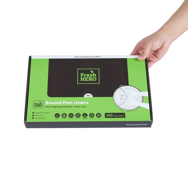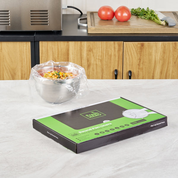 Ensure quick cleanup with high-performance disposable pan liners. Fresh Hero Contour-Fit Disposable Pan Liners are expertly designed to fit 4-quart round pans, preventing food from getting lost in liner corners and maximizing food yield. These non-stick pan liners feature a moisture-locking technology that retains the quality of soups and stews, ensuring your dishes remain flavorful and appealing. Made from nylon, these oven-safe pan liners withstand temperatures, making them ideal for rigorous commercial kitchens. The clear, 12-inch by 15-inch liners eliminate the need for scrubbing, streamlining your cleaning processes, and reducing labor costs. Their disposable nature not only promotes hygiene but also conserves water, further cutting operating expenses. Enhance operational efficiency and food quality with these indispensable kitchen tools. Each order includes 100 Fresh Hero Contour-Fit Disposable Pan Liners.