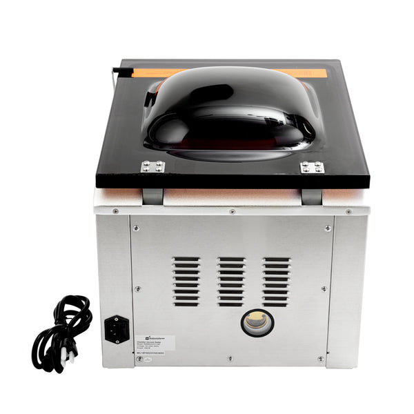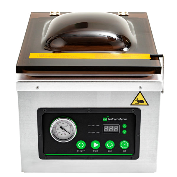 Expertly seal your food for later use with our Fresh Hero Stainless Steel Chamber Vacuum Packaging Machine. This food saver vacuum sealer includes a removable 12-inch bar to keep our matching Fresh Hero vacuum packaging bags tightly sealed. Featuring an oil pump, this food sealer stays quiet during operation to avoid disturbing patrons when conversing. With a built-in control panel, this vacuum packaging machine is easy to use, so you can effortlessly seal ingredients. The transparent lid of this commercial vacuum sealer provides a view of the packaging process for ensuring food is sealed to your liking. Crafted with a stainless steel body, this vacuum packaging machine is strong and sturdy for using it over and over again. With 120V and a NEMA 5-15P plug, this vacuum food sealer is compatible with standard U.S. power outlets. Measuring 16.8 inches long by 14.1 inches wide by 14.4 inches tall, this food sealer machine has 2/5 horsepower. Sold in a 1 count box. Fresh Hero vacuum packaging bags are available and sold separately.