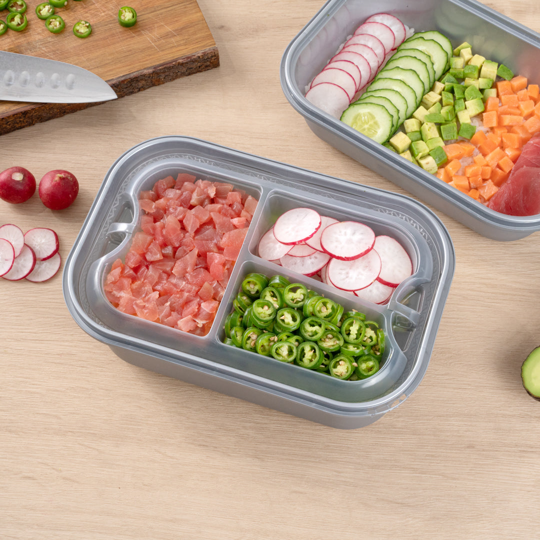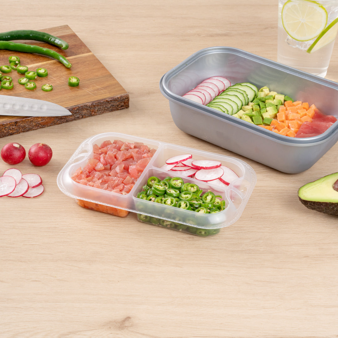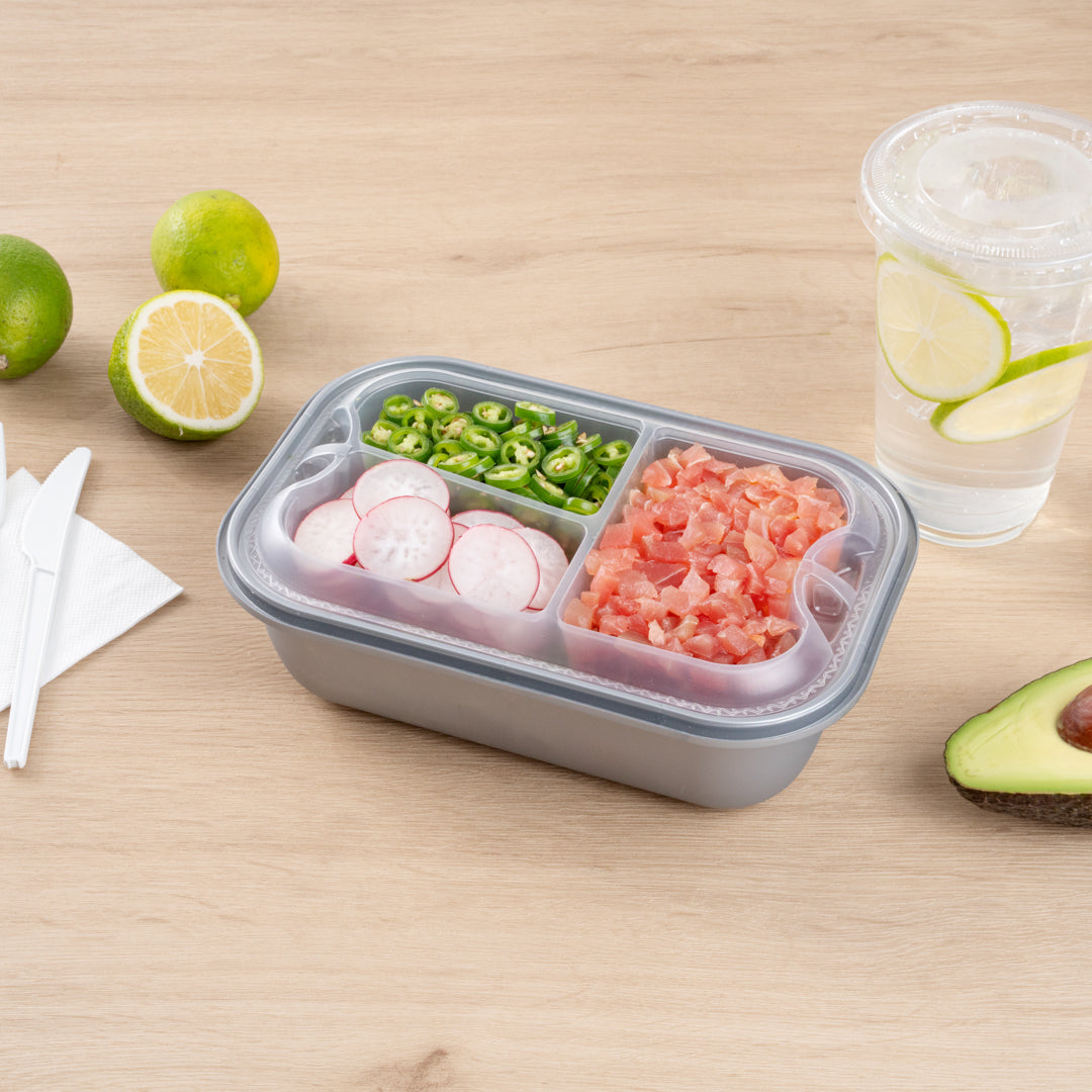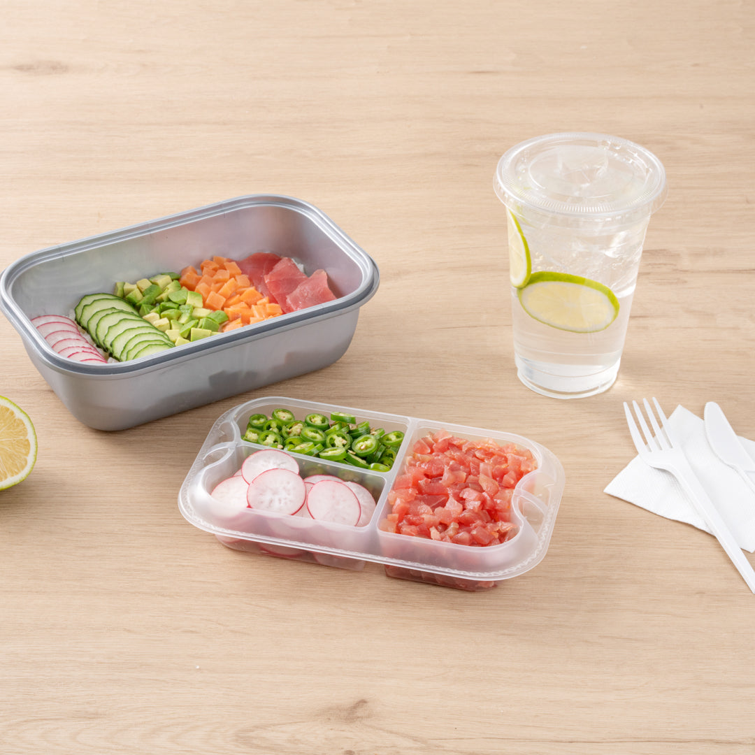 These compartment trays are compatible with our food containers to easily add more sides, snacks, sauces, or desserts to your meals. Plus, our take out containers securely lock in food, so you don’t have to worry about messy spills.