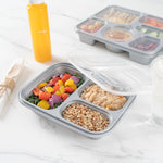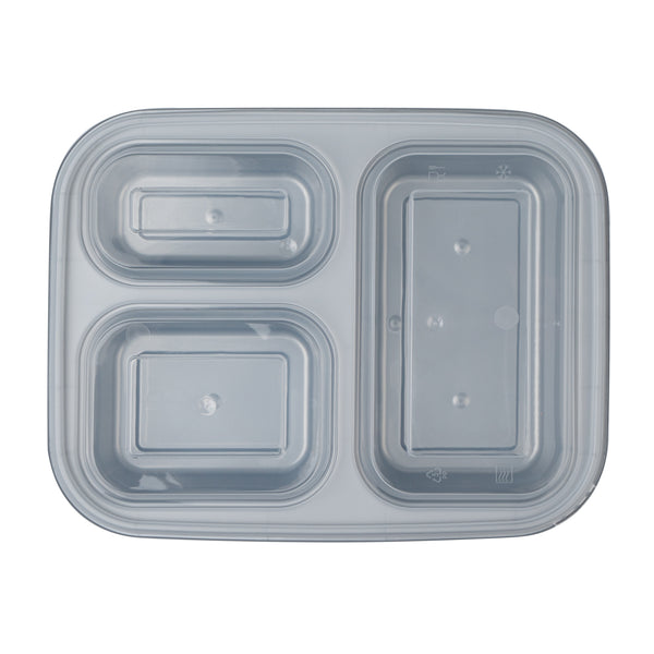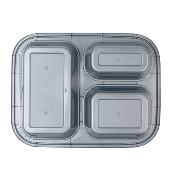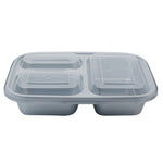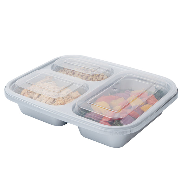 Keep meals untouched during transport with our Futura 30-ounce Rectangle Silver Plastic Tamper-Evident Take Out Containers. The tamper-evident break tab of these BPA-free take away boxes alerts customers when containers have been previously opened. The 3 compartments of these carry out containers have a capacity of 12.9, 8.8, and 6 ounces to allow you to pack up entrees and side dishes without using separate containers. With included lids, these take out boxes securely seal in foods to avoid messy spills. Plus, the lids' crystal-clear finish makes it easy for employees to identify dishes and avoid mixing up orders. To keep food warm and ready to enjoy, these tamper-evident containers are microwavable. Made from PP plastic, these to go boxes are recyclable for a quick and easy cleanup after serving a large number of guests. Featuring a silver finish, these microwavable take out containers add style to your delivery presentations. These carry out containers measure 9.5 inches long by 7.25 inches wide by 2 inches tall and contain up to 30 ounces. Sold in a 100 count box.