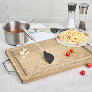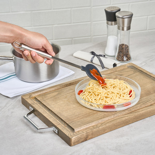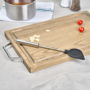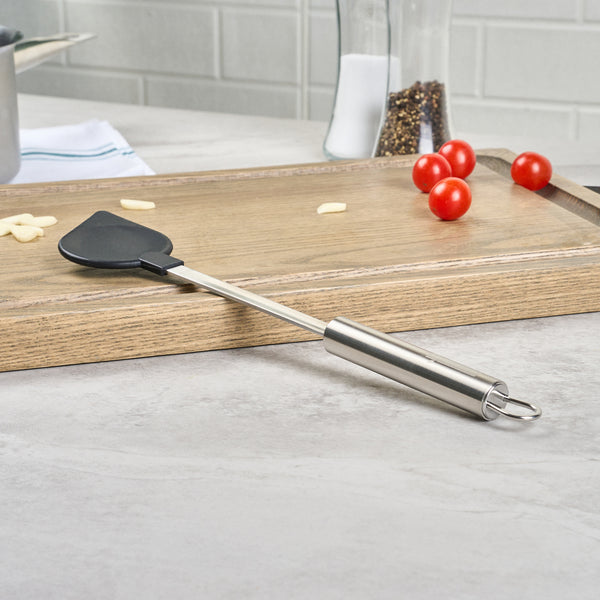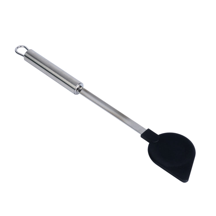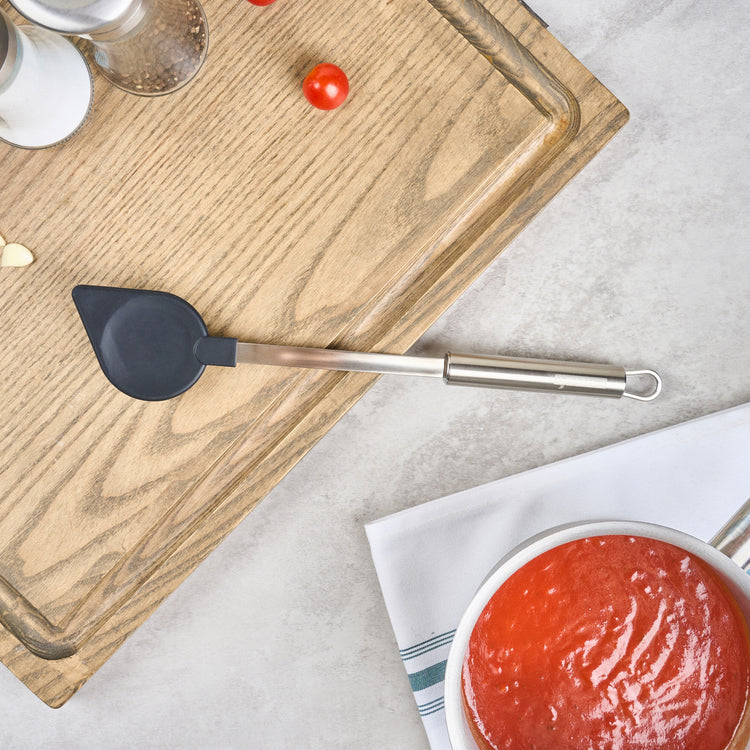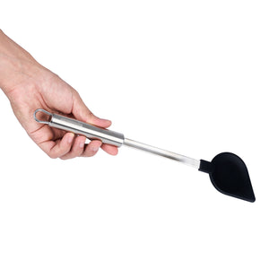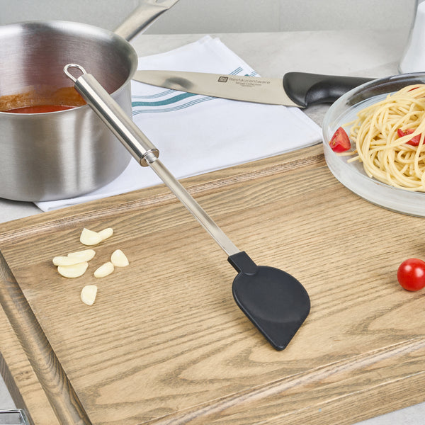 Enhance your cooking experience with precision and durability. The German Standard Black Soup Stirring Spoon combines a pointed tip design with a length of 12.8 inches, ensuring effortless maneuvering and scraping in large pots while keeping your hands safe from steam and heat. This heat-resistant spoon is crafted from high-heat resistant nylon, making it ideal for stirring soups, sauces, and stews in high-temperature cooking without melting or warping. Featuring a stainless steel handle, this nylon kitchen spoon offers an ergonomic grip, ensuring comfortable use even during long cooking sessions. Its pointed-oval shape reaches bowl edges, perfect for stirring soups and scraping every last drop of your culinary creations. Plus, its dishwasher safe design simplifies kitchen cleanup, allowing you to maintain your utensils with ease. Each order includes 1 German Standard Pointed Tip 12.8" Soup Stirring Spoon.