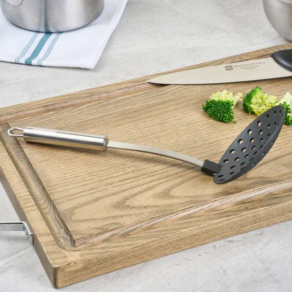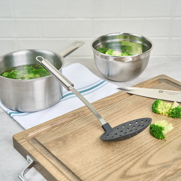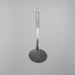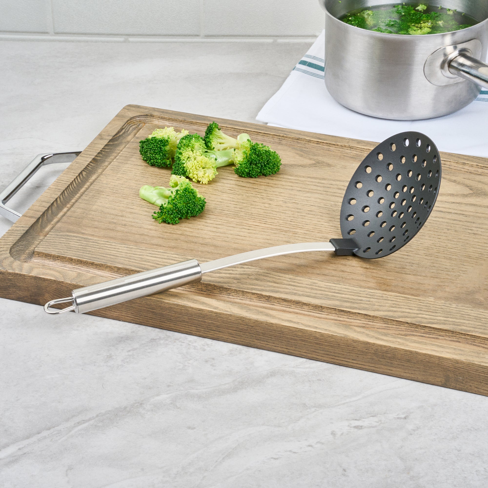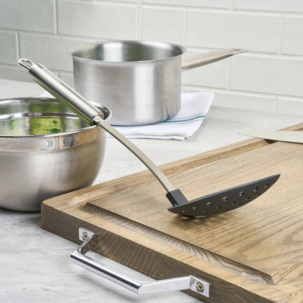 Efficiently handle hot food with this essential kitchen tool. The German Standard Stainless Steel Kitchen Skimmer features a robust slotted design that drains excess oil, promoting healthier dishes for your foodservice establishment. Constructed with a high-heat resistant nylon skimmer and a stainless steel handle, this nylon skimmer ensures longevity and safety under rigorous cooking conditions. The ergonomic handle enhances control, making it the perfect choice for chefs who demand precision in their culinary operations. Measuring 12 3/4 inches by 4 1/4 inches, it offers a substantial surface area for effective skimming and straining in busy kitchens. Its lightweight design reduces hand fatigue, allowing extended use without discomfort, which is crucial in high-volume food preparation. Equip your kitchen with this versatile slotted skimmer to enhance efficiency and maintain high standards of food quality. Each order includes 36 German Standard Stainless Steel Kitchen Skimmers.