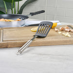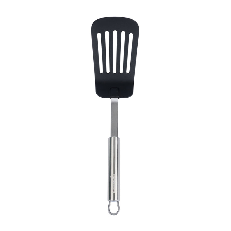 Elevate your kitchen arsenal with our German Standard Black Nylon High Heat Slotted Turner / Spatula. Crafted with a robust stainless steel handle, this fish spatula offers a steady grip and enhanced control during cooking. This cooking spatula is made from heat-resistant nylon and can withstand high temperatures up to 446F, making it ideal for various culinary tasks. Featuring a slotted blade, this pizza spatula allows excess oil or liquids to drain away while lifting food off the pan. The slotted nylon blade of this pancake spatula ensures it won't scratch or damage the surface of your non-stick pans. This griddle spatula is designed with a built-in eyelet hook, simplifying storage when it's not in use and keeping your kitchen space organized. Being dishwasher-safe, this turner spatula ensures a quick and efficient cleanup, making it ideal for busy kitchens. This egg spatula measures 12.4 inches in length by 3.1 inches in width by 1.5 inches in height and is designed to handle a wide variety of dish sizes. Sold in a 1 count box.