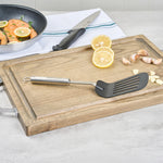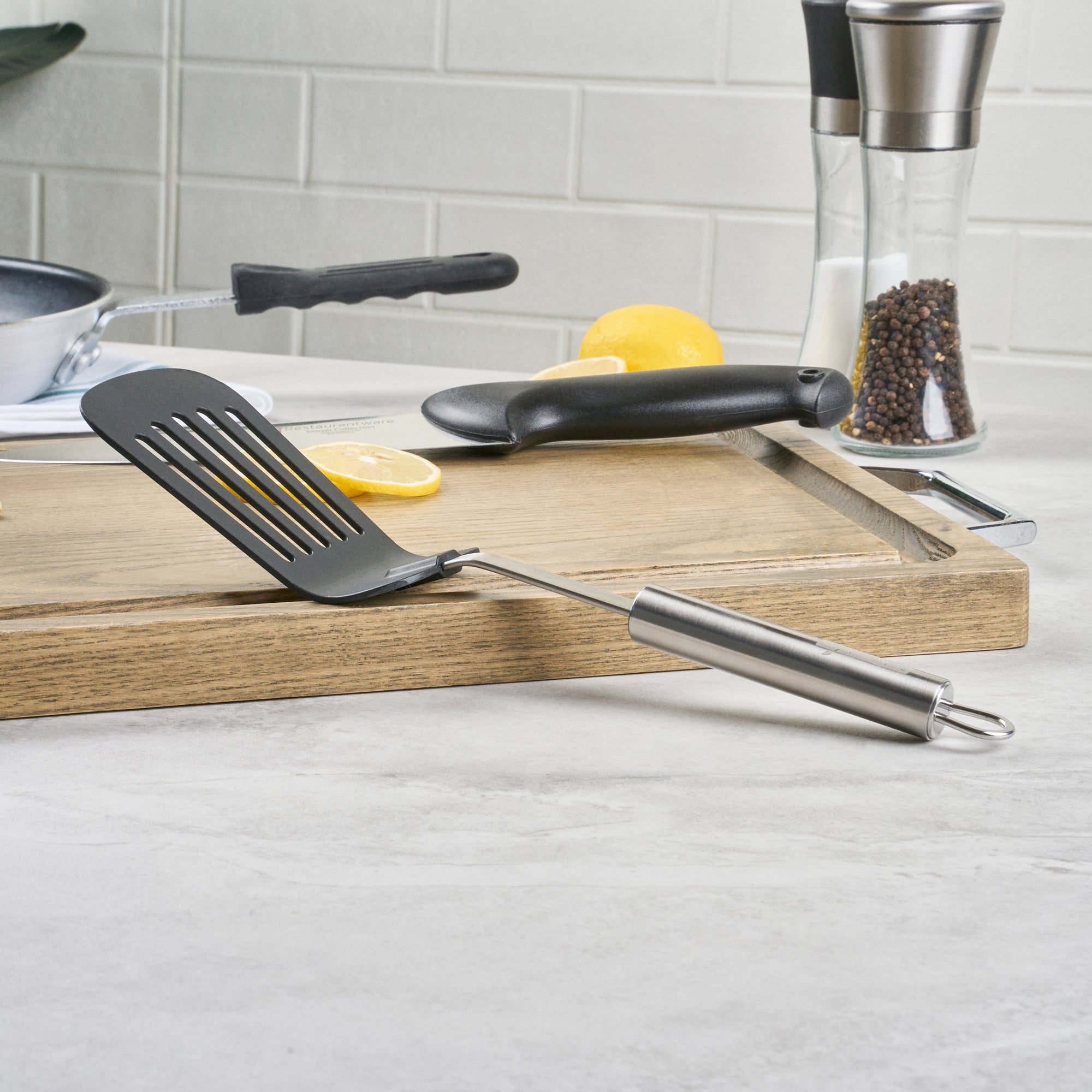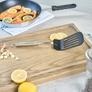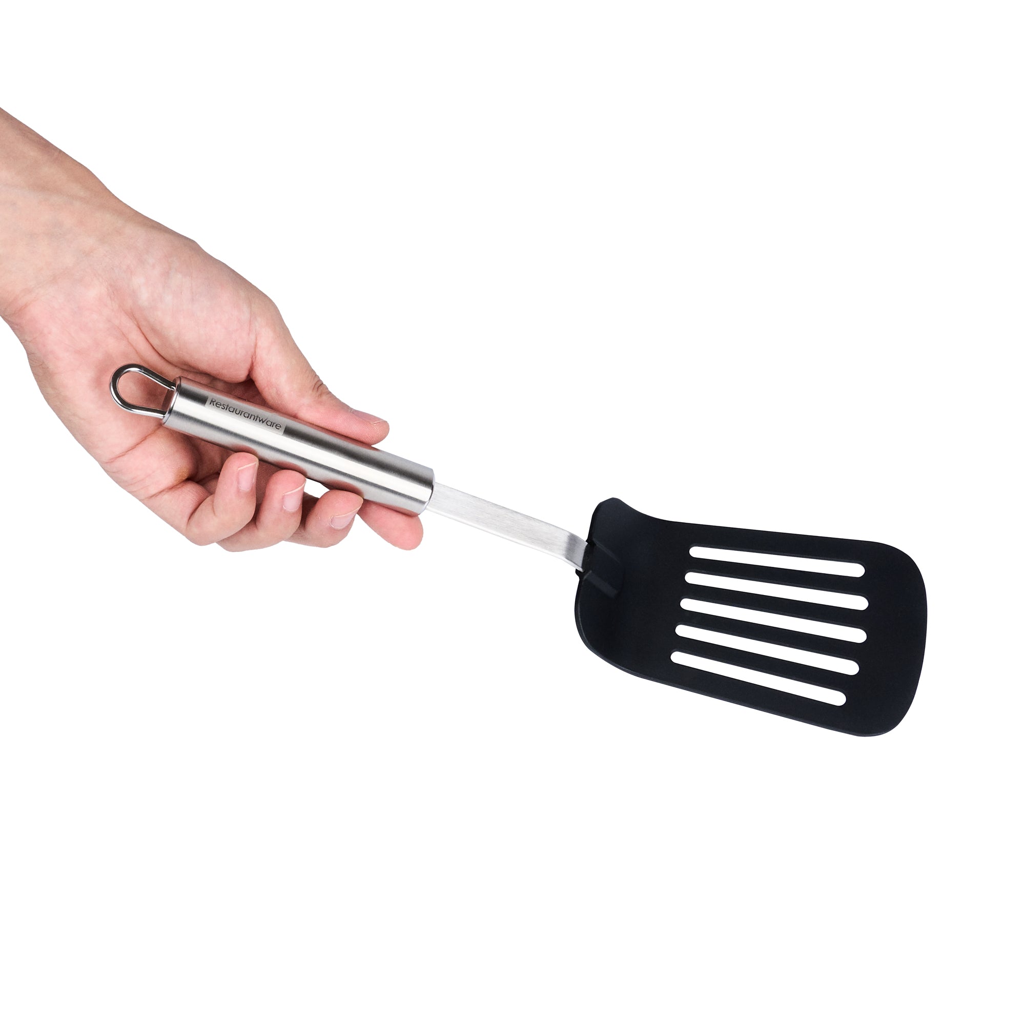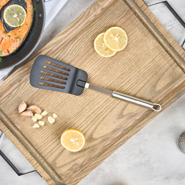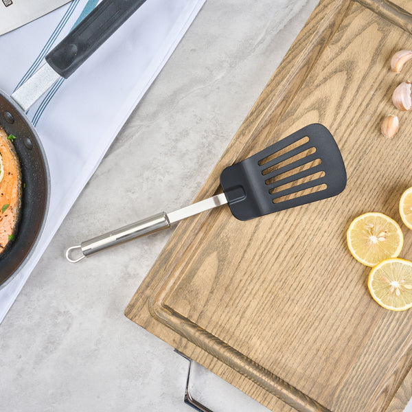- Slotted design effectively drains excess oil or liquid when lifting food off pan